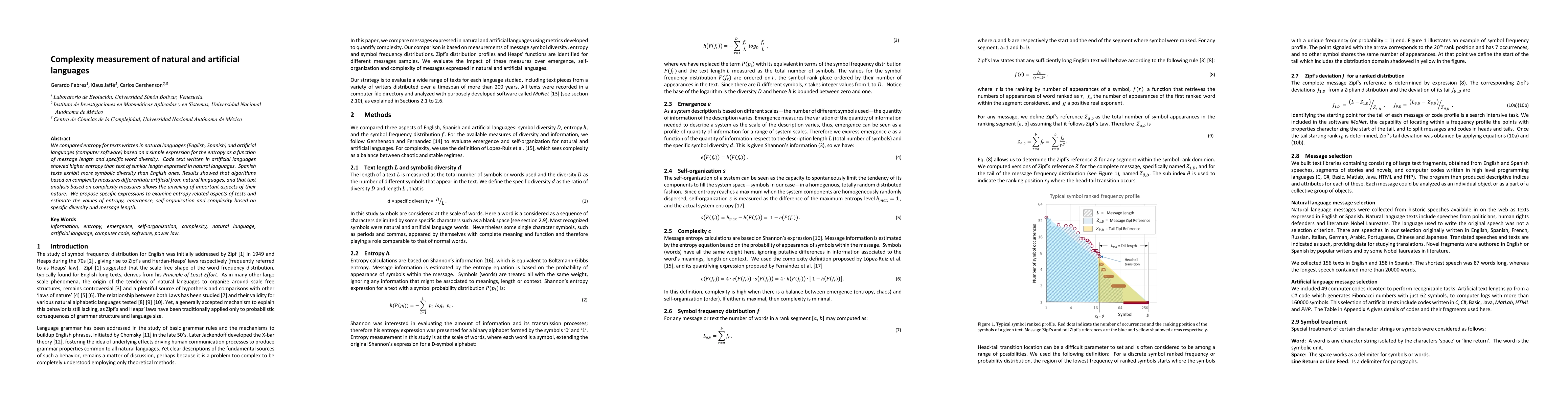 This paper compares entropy in natural languages (English, Spanish) and artificial languages (computer software), finding that artificial languages exhibit higher entropy. It proposes expressions to measure entropy, emergence, and complexity based on word diversity and message length, highlighting the potential of complexity measures to differentiate between natural and artificial languages.