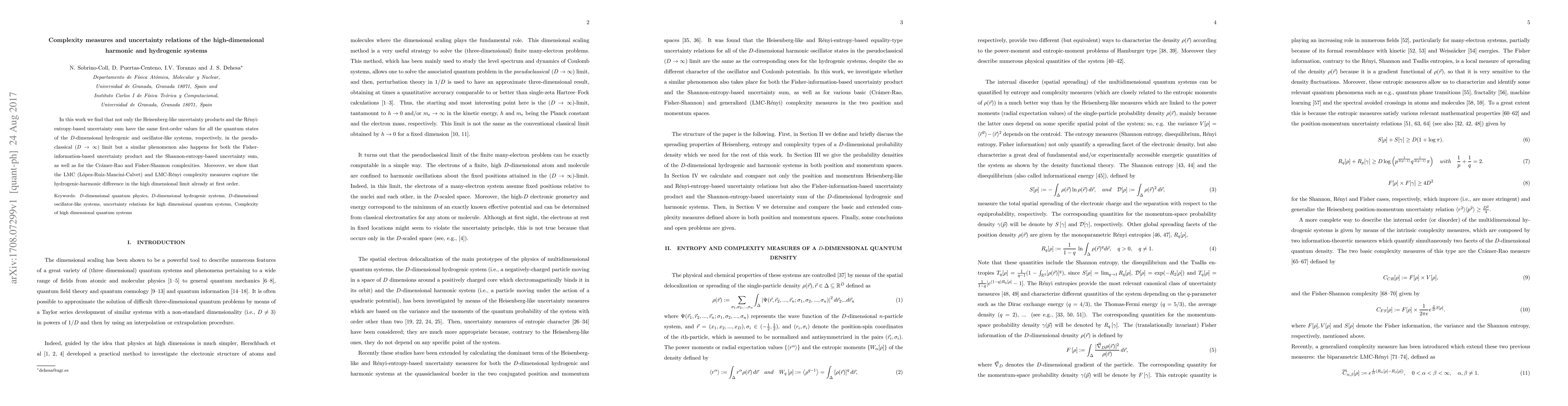 This paper investigates how various uncertainty relations and complexity measures converge for high-dimensional hydrogenic and harmonic systems in the pseudoclassical limit, revealing similar first-order values for both Heisenberg-like and entropy-based measures. It also demonstrates that LMC complexity measures effectively distinguish between hydrogenic and harmonic systems at first order.