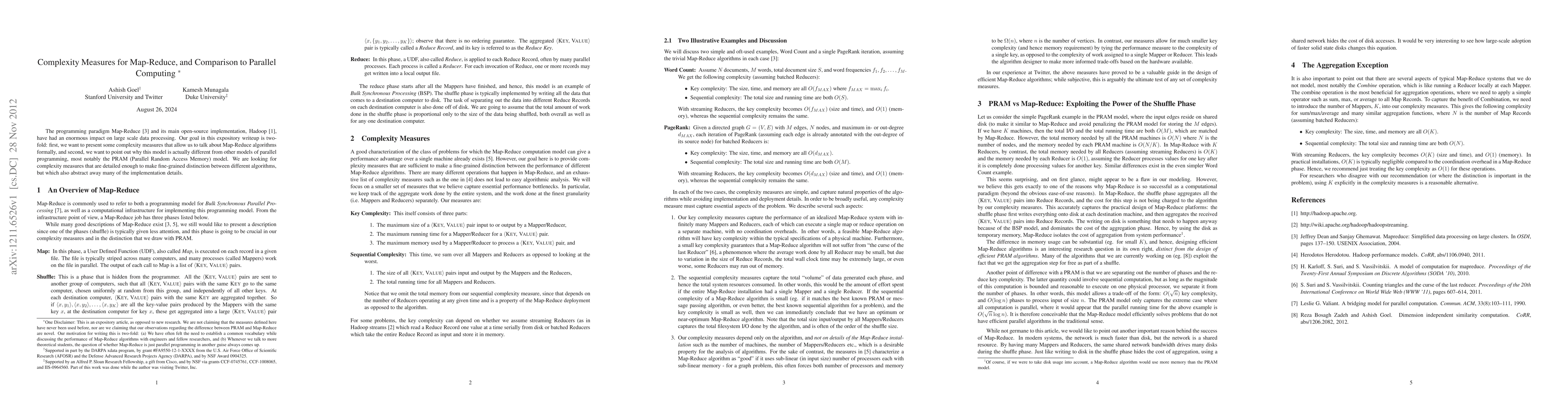 The programming paradigm Map-Reduce and its main open-source implementation, Hadoop, have had an enormous impact on large scale data processing. Our goal in this expository writeup is two-fold: first, we want to present some complexity measures that allow us to talk about Map-Reduce algorithms formally, and second, we want to point out why this model is actually different from other models of parallel programming, most notably the PRAM (Parallel Random Access Memory) model. We are looking for complexity measures that are detailed enough to make fine-grained distinction between different algorithms, but which also abstract away many of the implementation details.