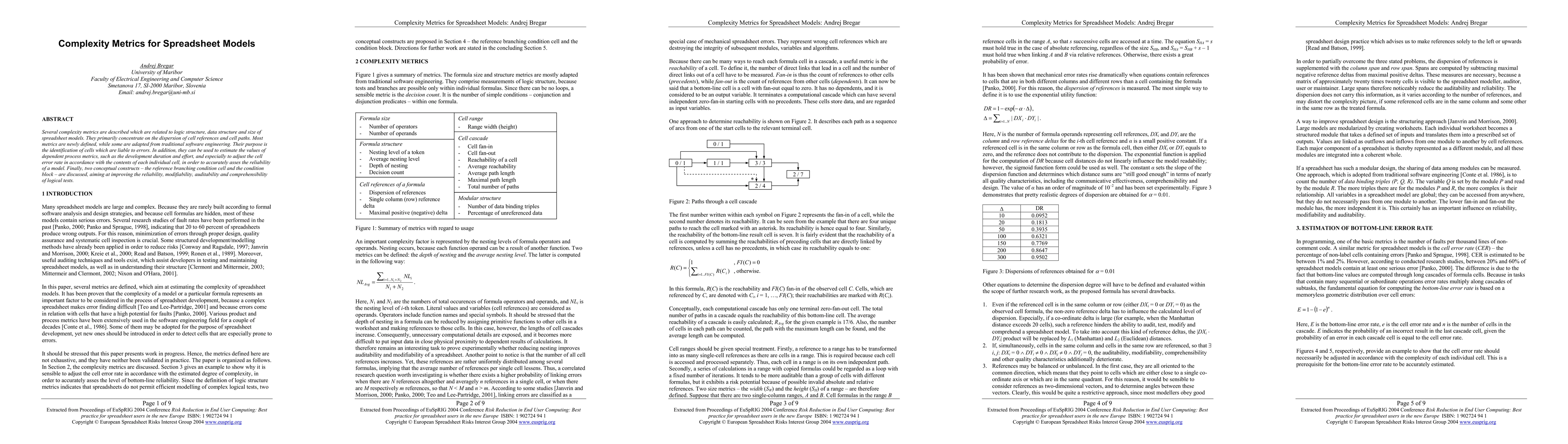 This paper introduces new complexity metrics for spreadsheet models to identify error-prone cells and estimate development time and effort, aiming to improve reliability and comprehensibility of logical tests.