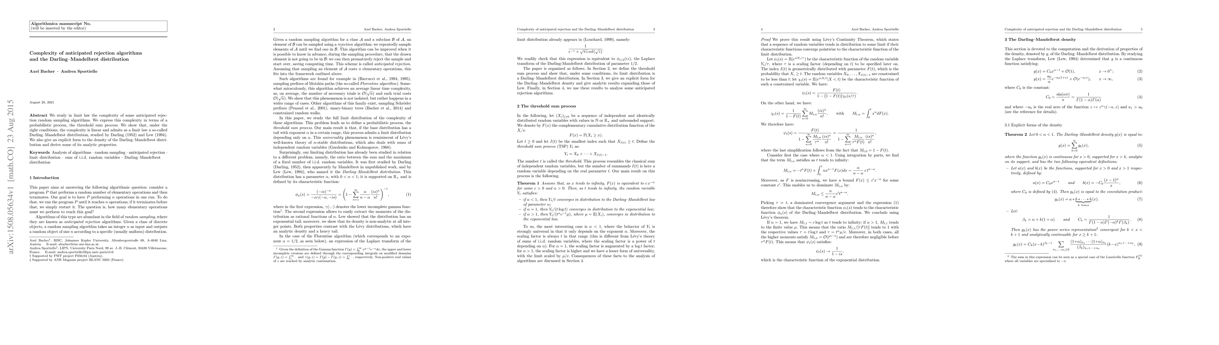 We study in limit law the complexity of some anticipated rejection random sampling algorithms. We express this complexity in terms of a probabilistic process, the threshold sum process. We show that, under the right conditions, the complexity is linear and admits as a limit law a so-called Darling-Mandelbrot distribution, studied by Darling (Trans Am Math Soc 73:95-107, 1952) and Lew (Constr Approx 10(1):15-30, 1994). We also give an explicit form to the density of the Darling-Mandelbrot distribution and derive some of its analytic properties.