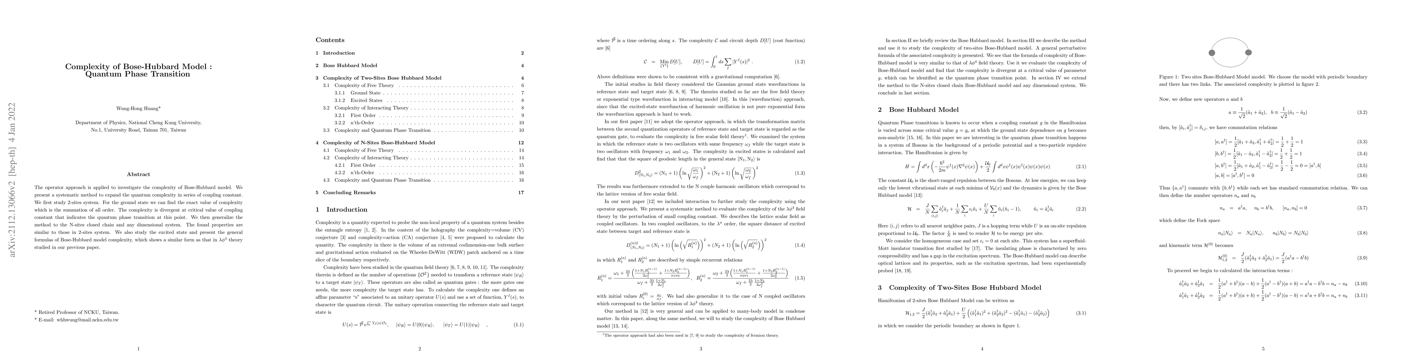 This paper investigates the quantum complexity of the Bose-Hubbard model using an operator approach, finding that complexity diverges at the critical coupling constant, indicating a quantum phase transition. The method is generalized to N-sites systems and higher dimensions, revealing similar properties.