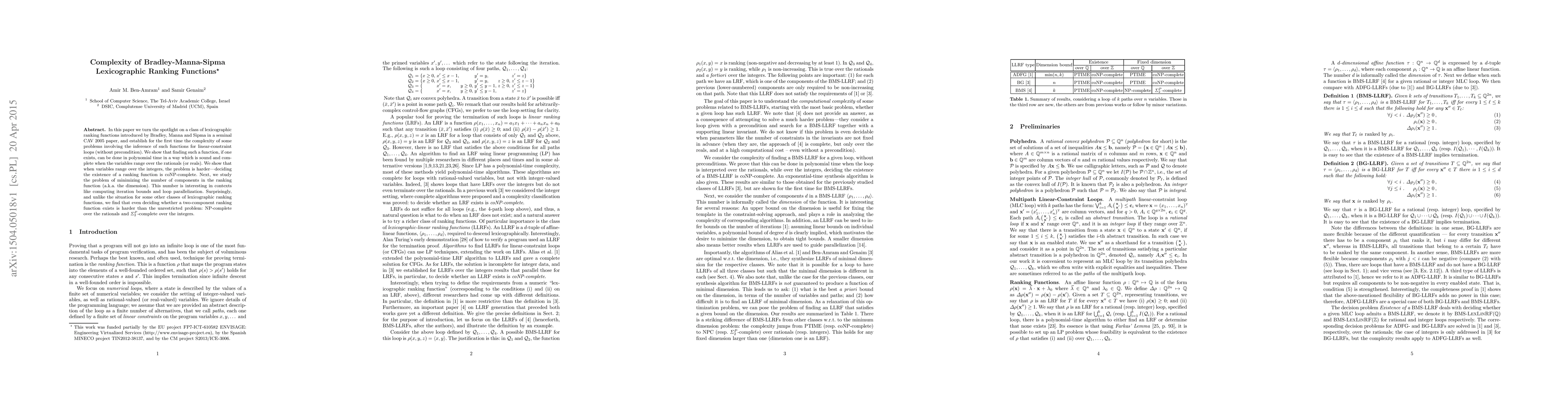 Researchers studied lexicographic ranking functions introduced by Bradley-Manna-Sipma and found that finding a function can be done in polynomial time for rational variables, but deciding its existence is coNP-complete for integer variables. Minimizing the number of components in the function is harder than expected.