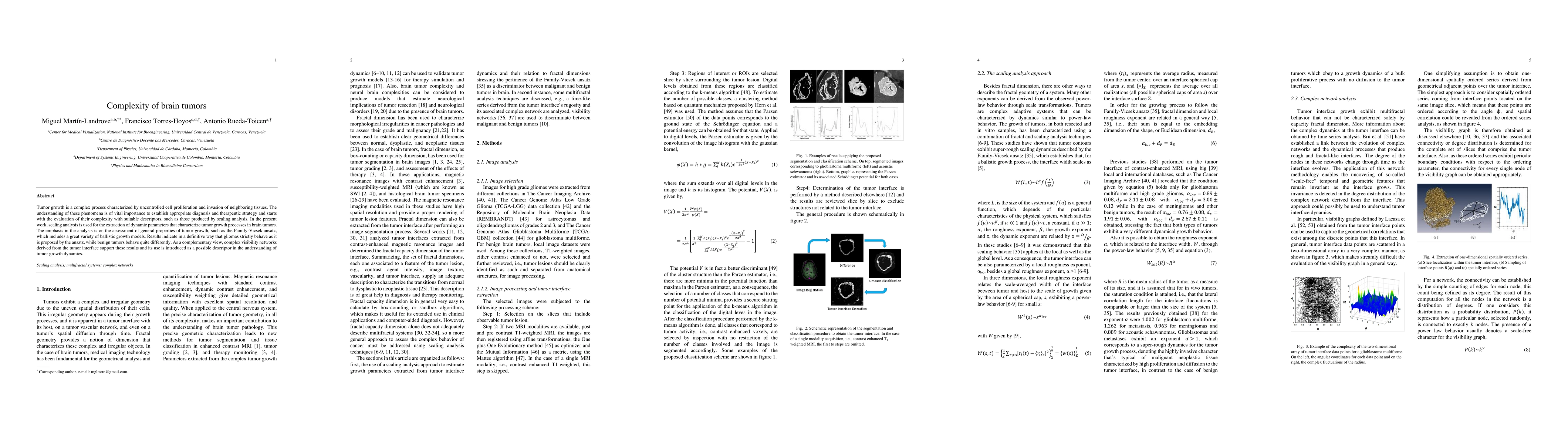 Tumor growth is a complex process characterized by uncontrolled cell proliferation and invasion of neighboring tissues. The understanding of these phenomena is of vital importance to establish appropriate diagnosis and therapeutic strategy and starts with the evaluation of their complexity with suitable descriptors, such as those produced by scaling analysis. In the present work, scaling analysis is used for the extraction of dynamic parameters that characterize tumor growth processes in brain tumors. The emphasis in the analysis is on the assessment of general properties of tumor growth, such as the Family-Vicsek ansatz, which includes a great variety of ballistic growth models. Results indicate in a definitive way that gliomas strictly behave as it is proposed by the ansatz, while benign tumors behave quite differently. As a complementary view, complex visibility networks derived from the tumor interface support these results and its use is introduced as a possible descriptor in the understanding of tumor growth dynamics.