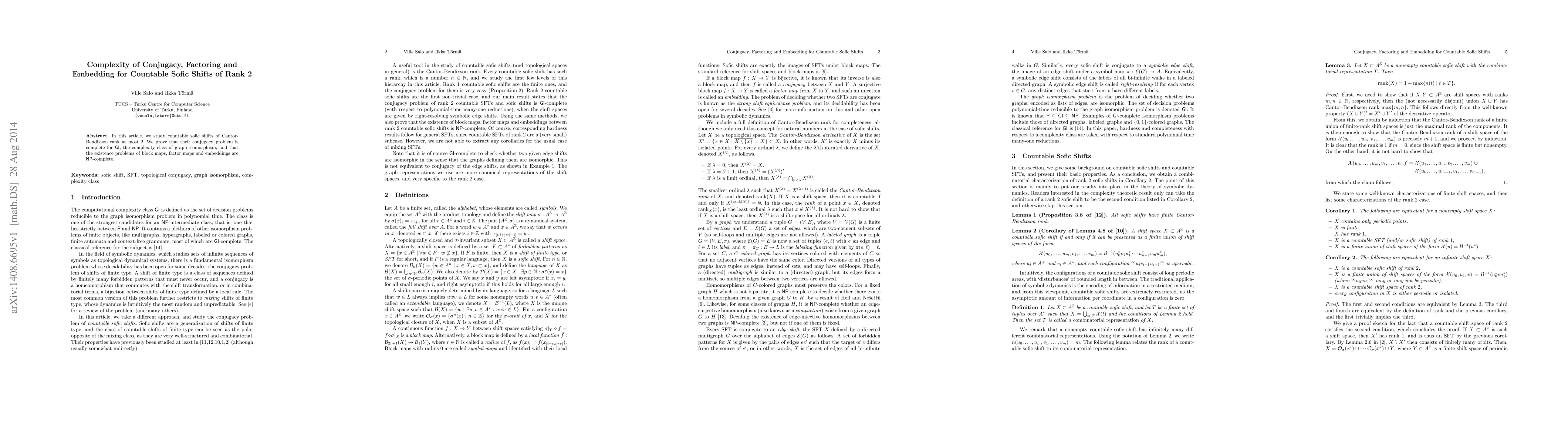 Summary: This research demonstrates that countable sofic shifts of rank 2 have a conjugacy problem equivalent to graph isomorphism complexity, and establishes NP-completeness for problems related to block maps, factor maps, and embeddings.