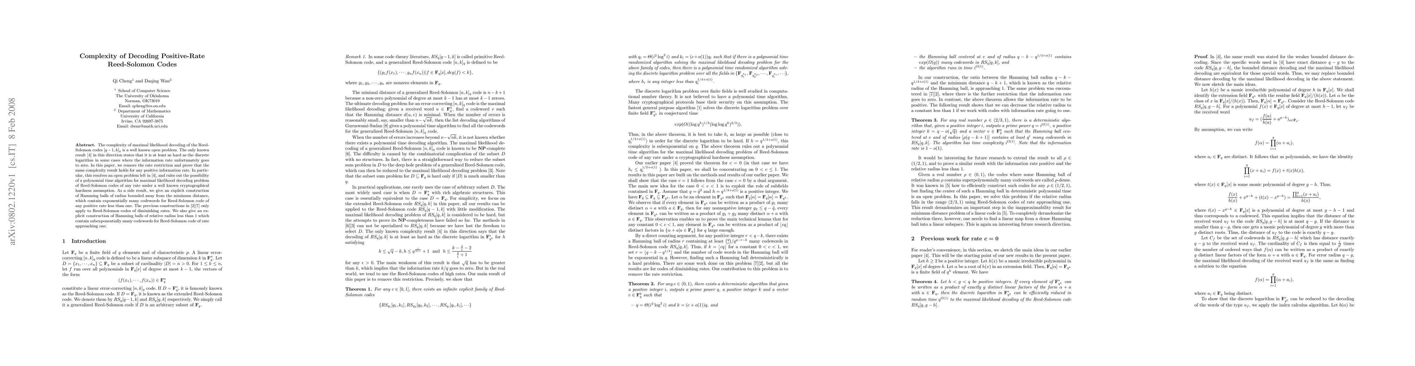 This paper resolves the open problem regarding the complexity of maximal likelihood decoding for Reed-Solomon codes, proving it is as hard as the discrete logarithm for any positive information rate, thus ruling out polynomial time algorithms. It also provides new constructions for Hamming balls containing exponentially many codewords for codes with positive rates.