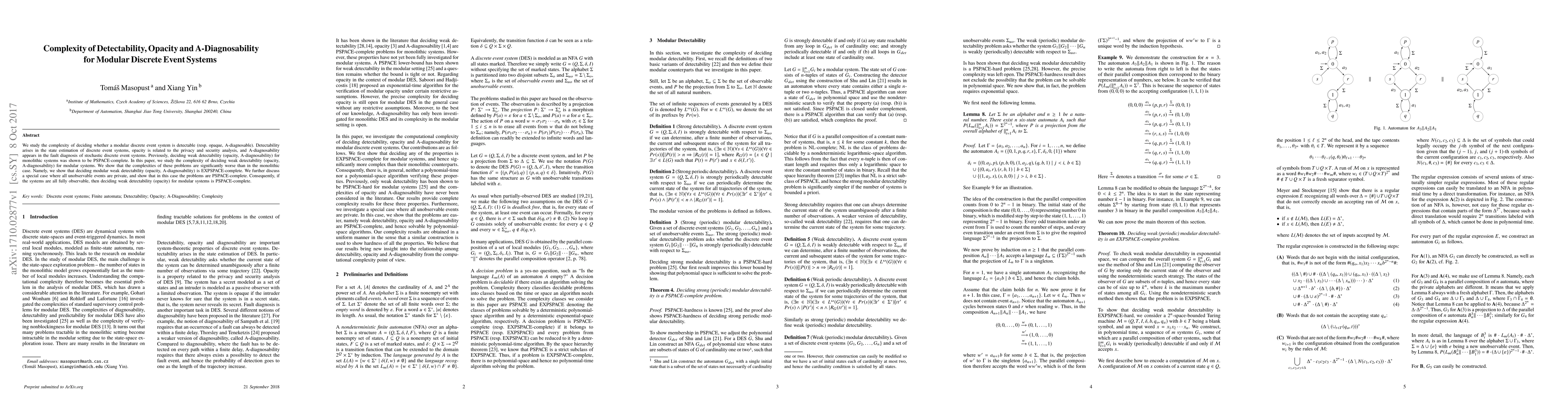 We study the complexity of deciding whether a modular discrete event system is detectable (resp. opaque, A-diagnosable). Detectability arises in the state estimation of discrete event systems, opacity is related to the privacy and security analysis, and A-diagnosability appears in the fault diagnosis of stochastic discrete event systems. Previously, deciding weak detectability (opacity, A-diagnosability) for monolithic systems was shown to be PSPACE-complete. In this paper, we study the complexity of deciding weak detectability (opacity, A-diagnosability) for modular systems. We show that the complexities of these problems are significantly worse than in the monolithic case. Namely, we show that deciding modular weak detectability (opacity, A-diagnosability) is EXPSPACE-complete. We further discuss a special case where all unobservable events are private, and show that in this case the problems are PSPACE-complete. Consequently, if the systems are all fully observable, then deciding weak detectability (opacity) for modular systems is PSPACE-complete.