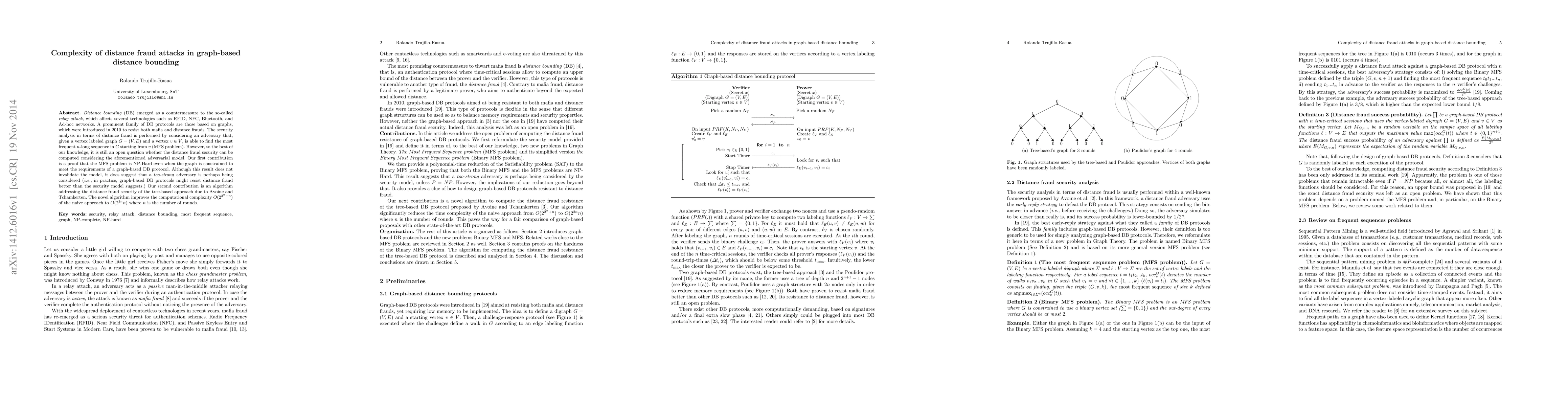 Distance bounding (DB) emerged as a countermeasure to the so-called \emph{relay attack}, which affects several technologies such as RFID, NFC, Bluetooth, and Ad-hoc networks. A prominent family of DB protocols are those based on graphs, which were introduced in 2010 to resist both mafia and distance frauds. The security analysis in terms of distance fraud is performed by considering an adversary that, given a vertex labeled graph $G = (V, E)$ and a vertex $v \in V$, is able to find the most frequent $n$-long sequence in $G$ starting from $v$ (MFS problem). However, to the best of our knowledge, it is still an open question whether the distance fraud security can be computed considering the aforementioned adversarial model. Our first contribution is a proof that the MFS problem is NP-Hard even when the graph is constrained to meet the requirements of a graph-based DB protocol. Although this result does not invalidate the model, it does suggest that a \emph{too-strong} adversary is perhaps being considered (i.e., in practice, graph-based DB protocols might resist distance fraud better than the security model suggests.) Our second contribution is an algorithm addressing the distance fraud security of the tree-based approach due to Avoine and Tchamkerten. The novel algorithm improves the computational complexity $O(2^{2^n+n})$ of the naive approach to $O(2^{2n}n)$ where $n$ is the number of rounds.