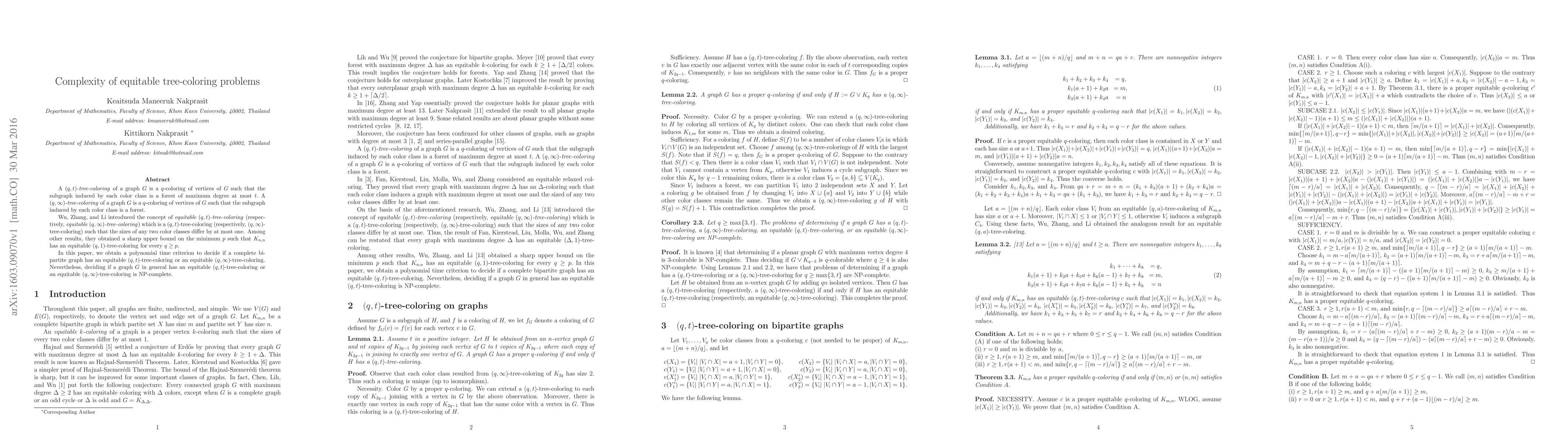 This paper explores equitable tree-coloring problems, providing a polynomial time criterion for determining equitable $(q,t)$-tree-coloring in complete bipartite graphs, while proving the general problem to be NP-complete.
