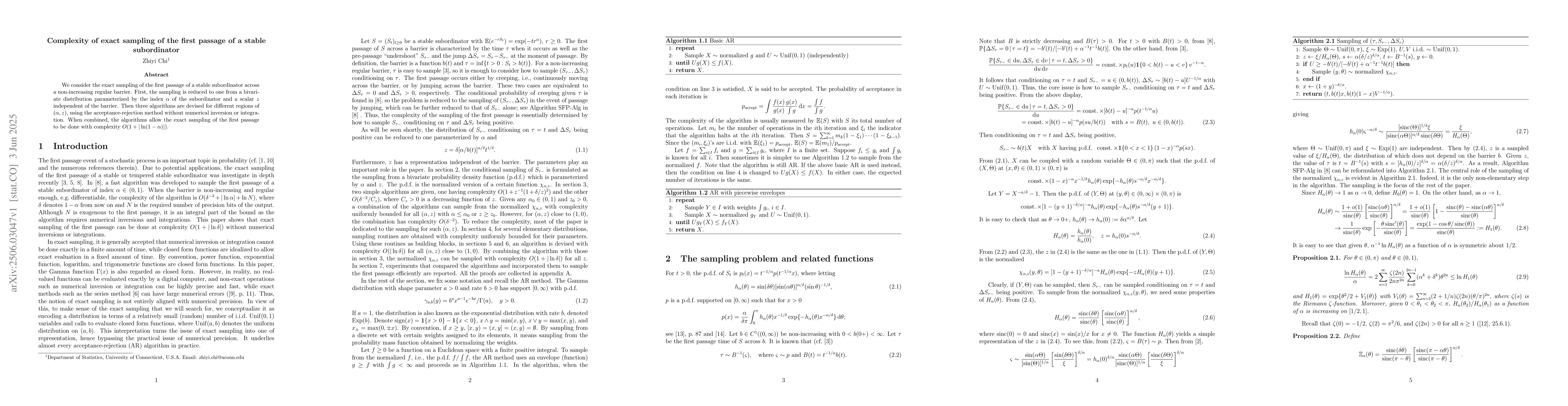 Researchers developed algorithms to exactly sample the first passage of a stable subordinator across a non-increasing regular barrier, achieving complexity O(1+| ln(1-α)|).