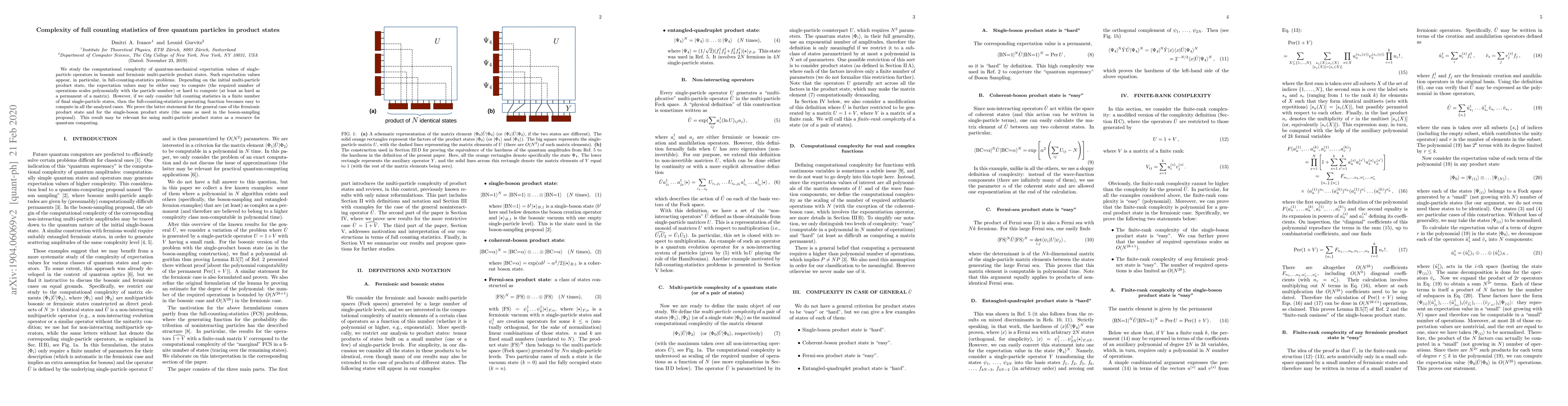We study the computational complexity of quantum-mechanical expectation values of single-particle operators in bosonic and fermionic multi-particle product states. Such expectation values appear, in particular, in full-counting-statistics problems. Depending on the initial multi-particle product state, the expectation values may be either easy to compute (the required number of operations scales polynomially with the particle number) or hard to compute (at least as hard as a permanent of a matrix). However, if we only consider full counting statistics in a finite number of final single-particle states, then the full-counting-statistics generating function becomes easy to compute in all the analyzed cases. We prove the latter statement for the general case of the fermionic product state and for the single-boson product state (the same as used in the boson-sampling proposal). This result may be relevant for using multi-particle product states as a resource for quantum computing.