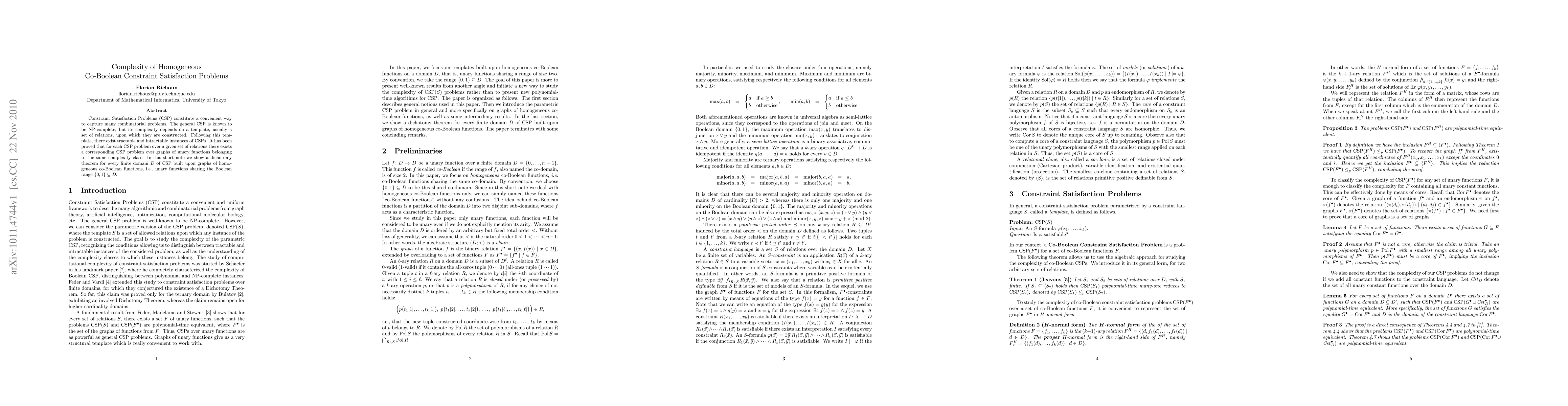 This paper presents a dichotomy theorem for homogeneous co-Boolean Constraint Satisfaction Problems (CSP), demonstrating that CSPs over graphs of such unary functions fall into either tractable or intractable complexity classes. The study highlights the dependency of CSP complexity on the underlying template of relations.