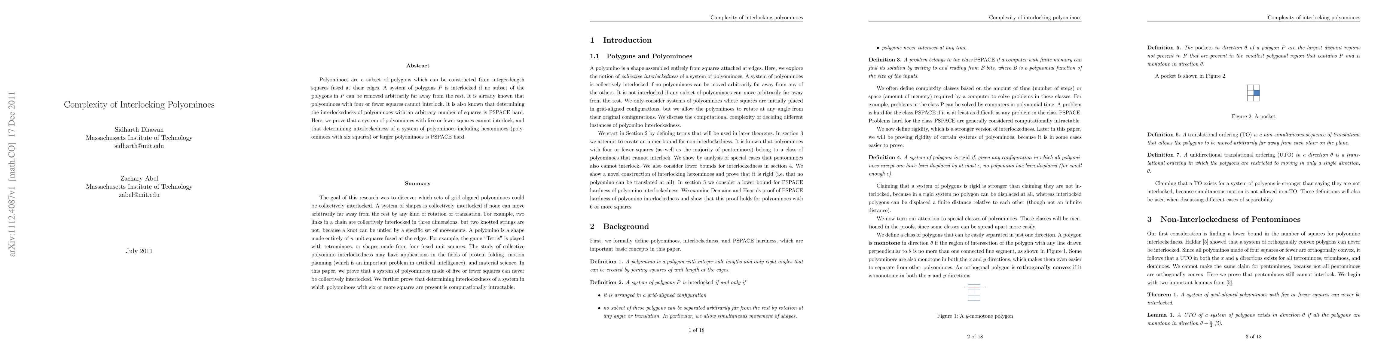 This paper proves that polyominoes with five or fewer squares cannot interlock and establishes that determining the interlockedness of systems containing hexominoes or larger polyominoes is PSPACE hard.