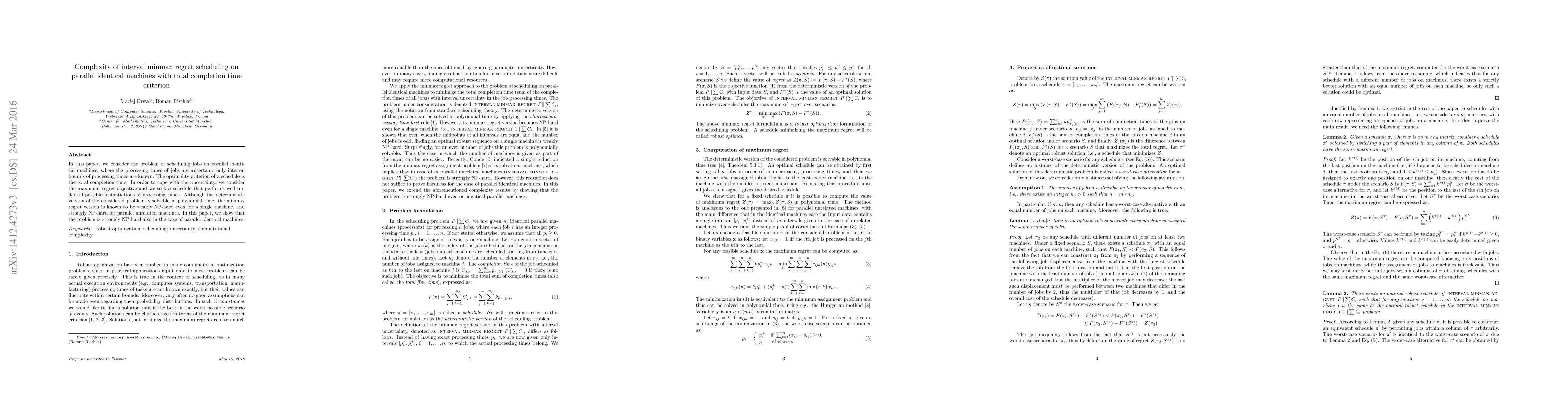 This paper investigates the complexity of scheduling jobs on parallel identical machines with interval bounds on processing times, aiming to minimize the total completion time under the minmax regret criterion. The authors demonstrate that this problem is strongly NP-hard, even for parallel identical machines, extending the known complexity for single machines and unrelated parallel machines.