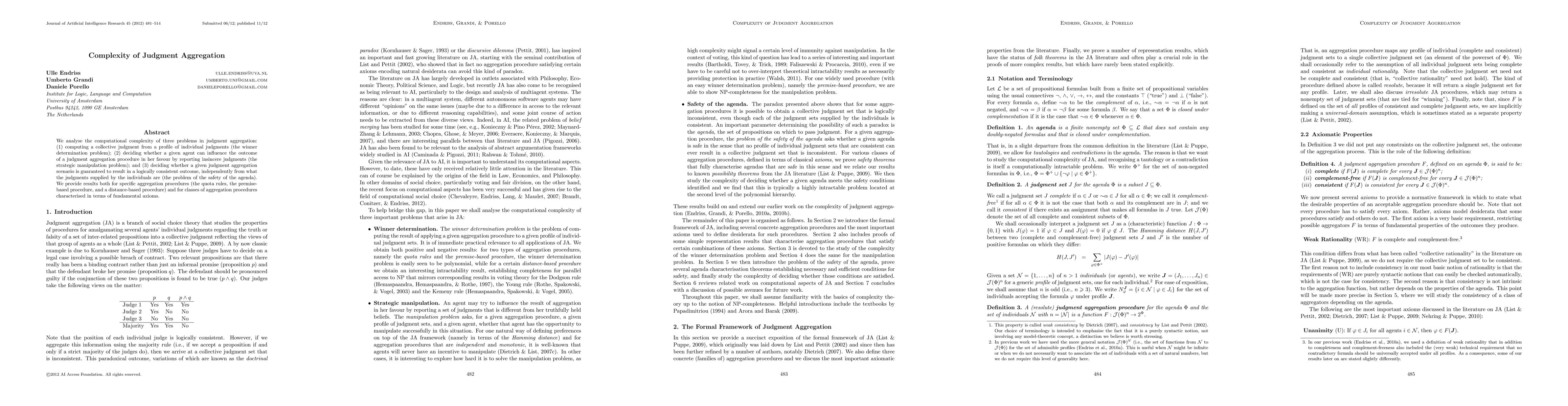This paper examines the computational complexity of three judgment aggregation problems: determining collective judgments, detecting strategic manipulation, and ensuring logical consistency. It analyzes specific aggregation methods and broader classes of procedures defined by fundamental axioms.
