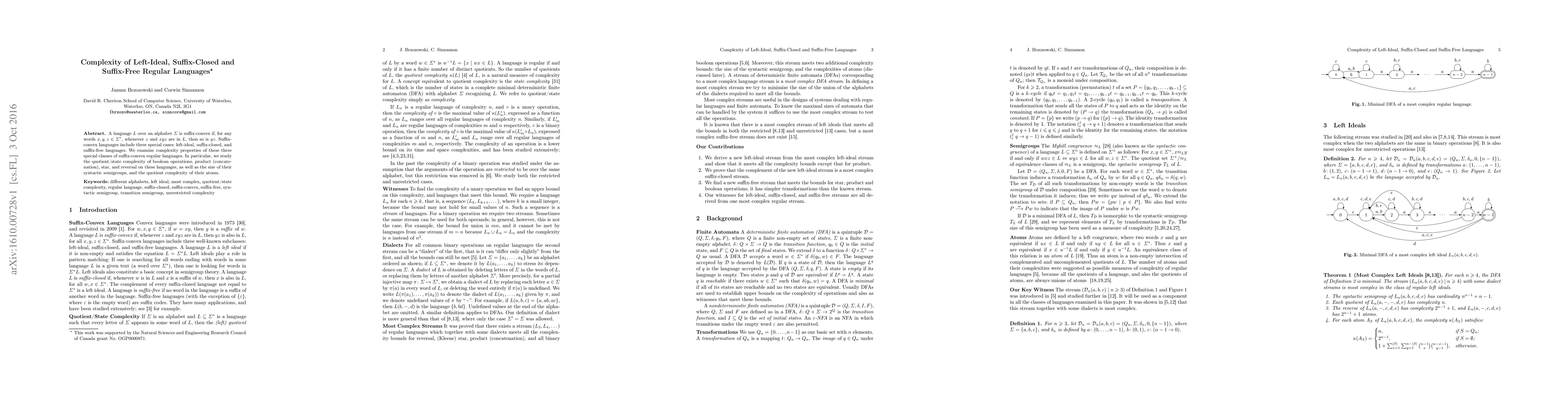 A language $L$ over an alphabet $\Sigma$ is suffix-convex if, for any words $x,y,z\in\Sigma^*$, whenever $z$ and $xyz$ are in $L$, then so is $yz$. Suffix-convex languages include three special cases: left-ideal, suffix-closed, and suffix-free languages. We examine complexity properties of these three special classes of suffix-convex regular languages. In particular, we study the quotient/state complexity of boolean operations, product (concatenation), star, and reversal on these languages, as well as the size of their syntactic semigroups, and the quotient complexity of their atoms.