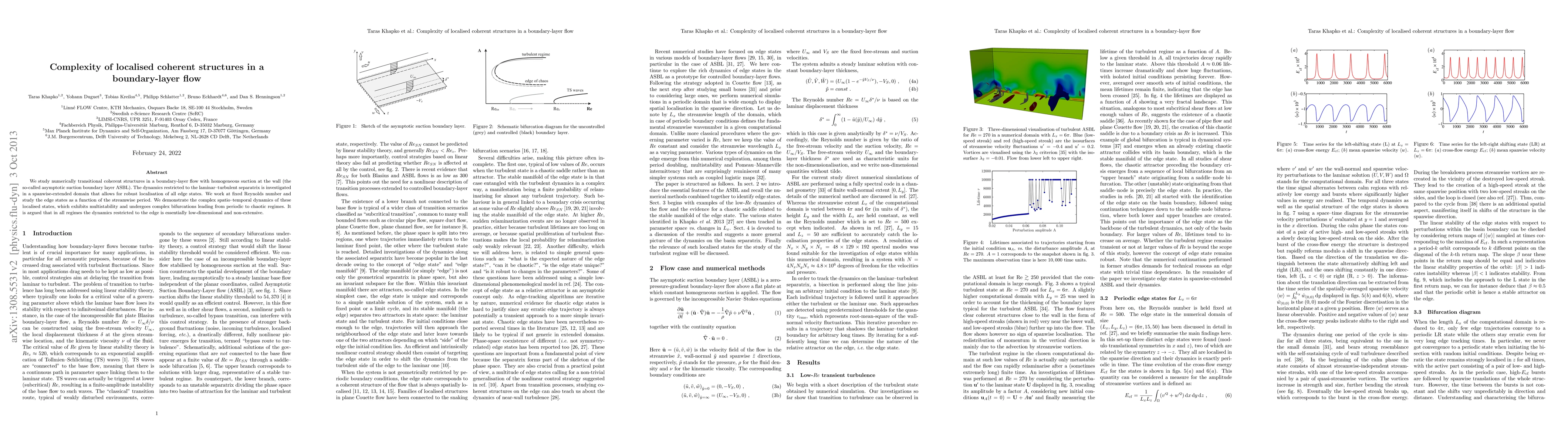The study uses numerical simulations to investigate transitional coherent structures in an asymptotic suction boundary layer (ASBL) at a fixed Reynolds number. The dynamics are explored in a spanwise-extended domain, allowing for robust localization of all edge states, and as a function of the streamwise period.