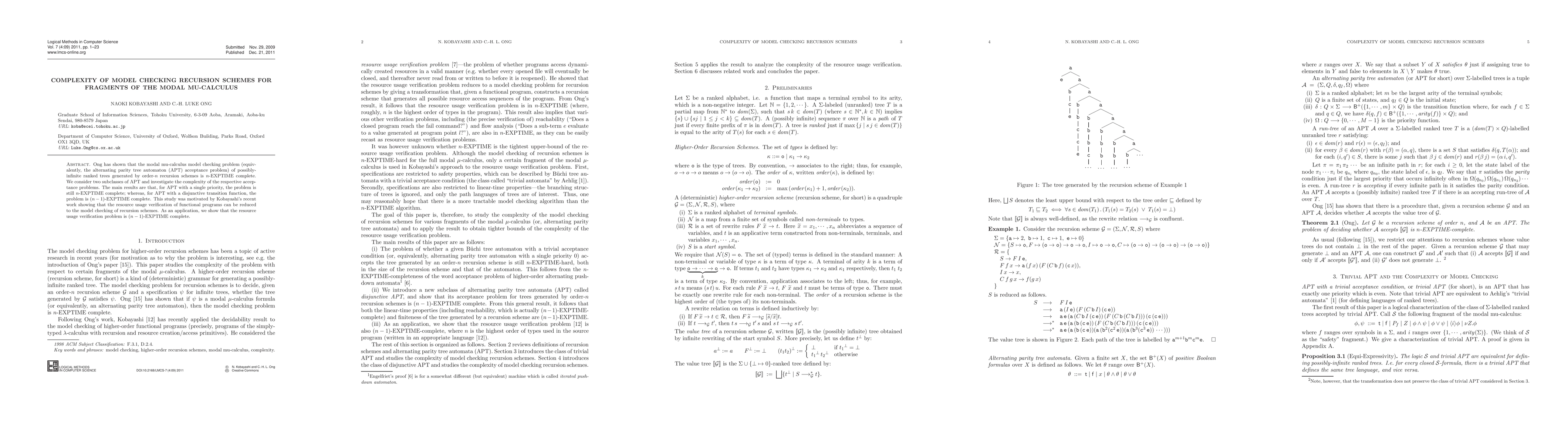 The research explores the complexity of model checking recursion schemes for two subclasses of the modal mu-calculus. It finds that single-priority APT remains n-EXPTIME complete, while disjunctive transition function APT is (n-1)-EXPTIME complete, contributing to understanding resource usage verification in functional programs.