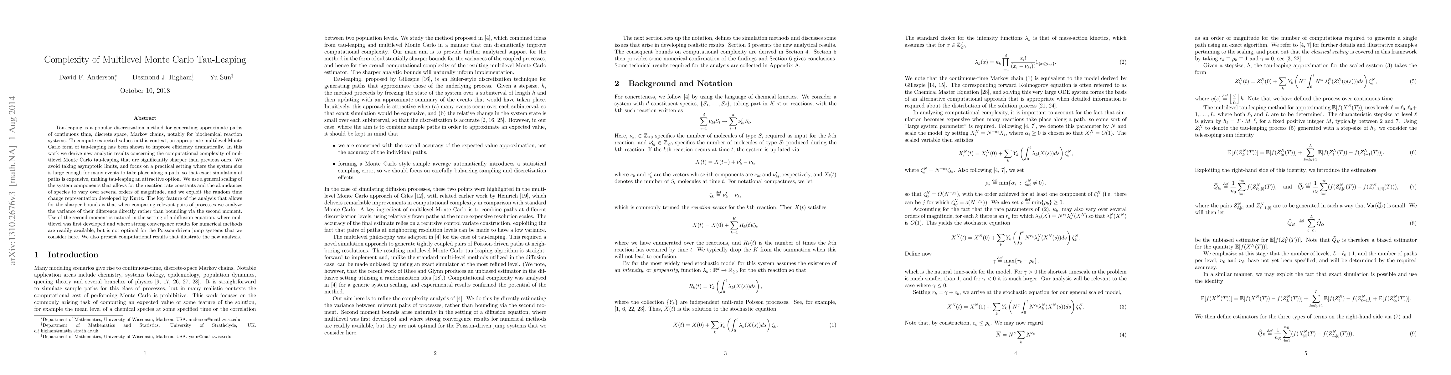 This paper derives new analytic results for the computational complexity of multilevel Monte Carlo tau-leaping, providing sharper bounds than previous methods by directly analyzing the variance of process differences rather than relying on second moments. The analysis focuses on practical, large-scale systems where exact simulation is costly, and computational results support the theoretical findings.