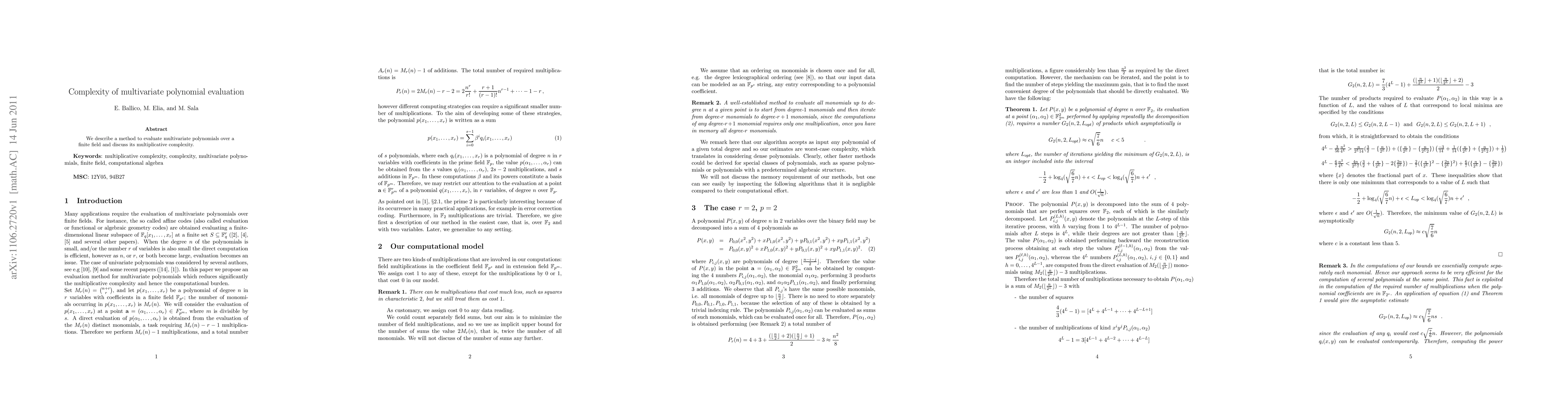 Summary: This paper presents a novel method for evaluating multivariate polynomials over finite fields, focusing on the analysis and optimization of its multiplicative complexity. The approach aims to enhance computational efficiency in polynomial evaluations.