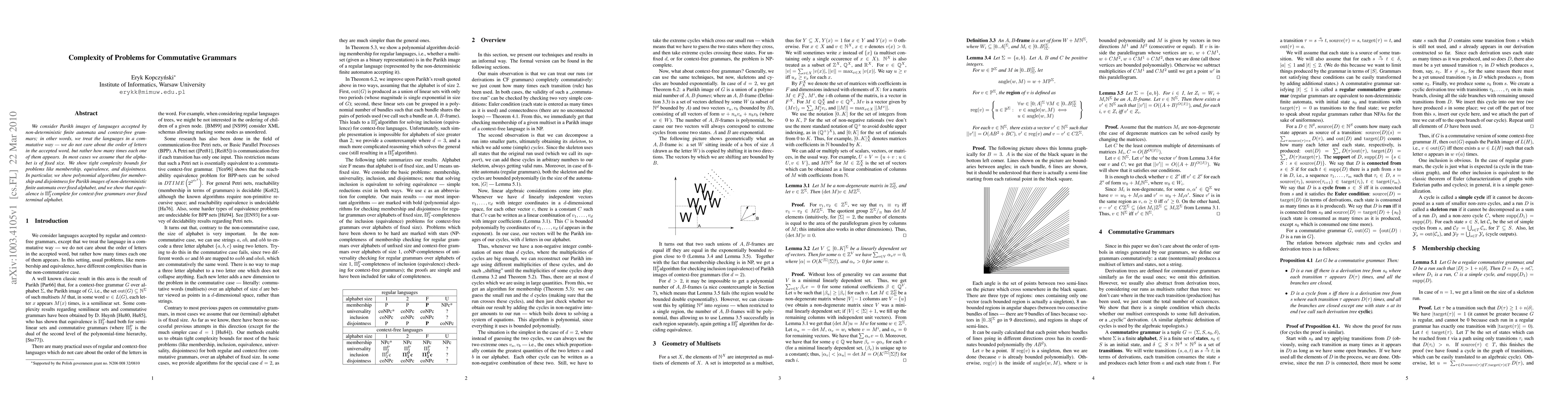 This paper investigates the complexity of problems related to commutative grammars, focusing on Parikh images of languages accepted by non-deterministic finite automata and context-free grammars. It demonstrates polynomial algorithms for membership and disjointness for Parikh images of finite automata, and proves that equivalence is Pi2P complete for context-free grammars.