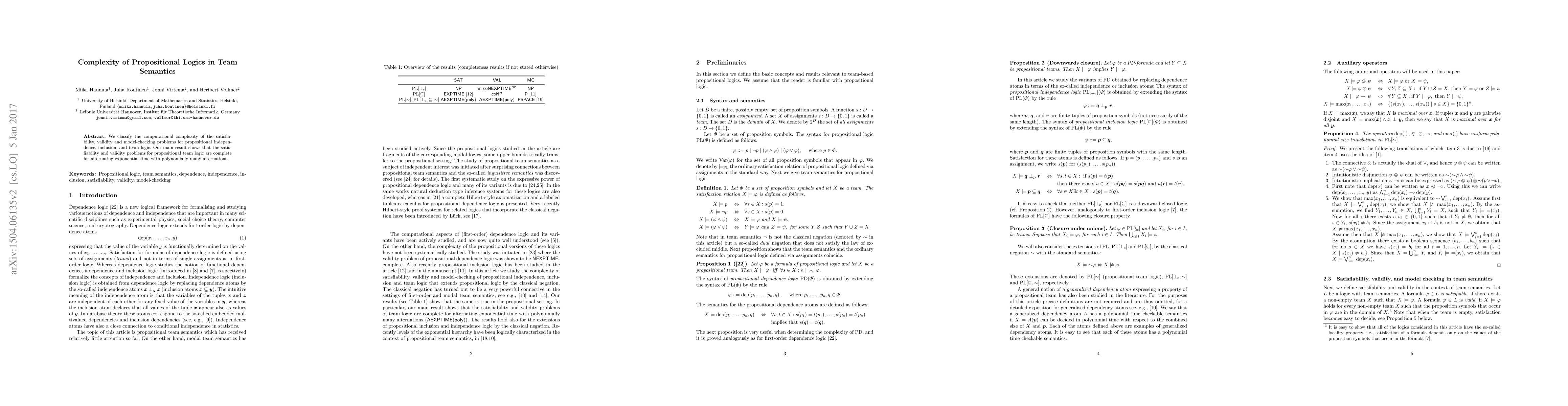 This paper classifies the computational complexity of various problems in propositional logics, specifically focusing on team semantics. It demonstrates that the satisfiability and validity problems for propositional team logic are complete for alternating exponential-time with polynomially many alternations.