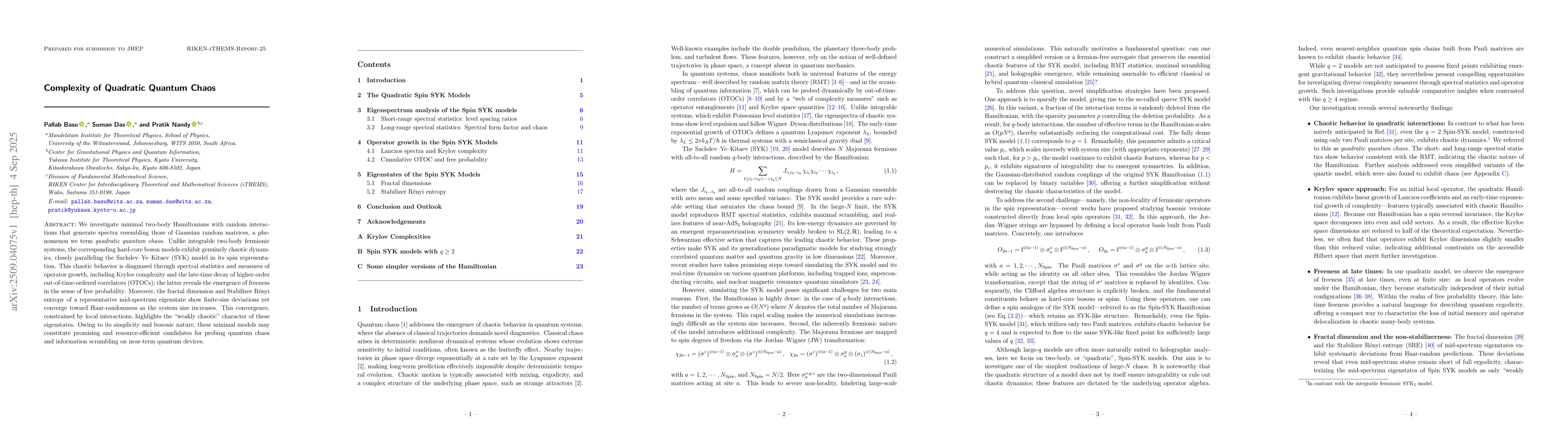 We investigate minimal two-body Hamiltonians with random interactions that generate spectra resembling those of Gaussian random matrices, a phenomenon we term quadratic quantum chaos. Unlike integrable two-body fermionic systems, the corresponding hard-core boson models exhibit genuinely chaotic dynamics, closely paralleling the Sachdev-Ye-Kitaev (SYK) model in its spin representation. This chaotic behavior is diagnosed through spectral statistics and measures of operator growth, including Krylov complexity and the late-time decay of higher-order out-of-time-ordered correlators (OTOCs); the latter reveals the emergence of freeness in the sense of free probability. Moreover, the fractal dimension and Stabilizer Renyi entropy of a representative mid-spectrum eigenstate show finite-size deviations yet converge toward Haar-randomness as the system size increases. This convergence, constrained by local interactions, highlights the "weakly chaotic" character of these eigenstates. Owing to its simplicity and bosonic nature, these minimal models may constitute promising and resource-efficient candidates for probing quantum chaos and information scrambling on near-term quantum devices.
