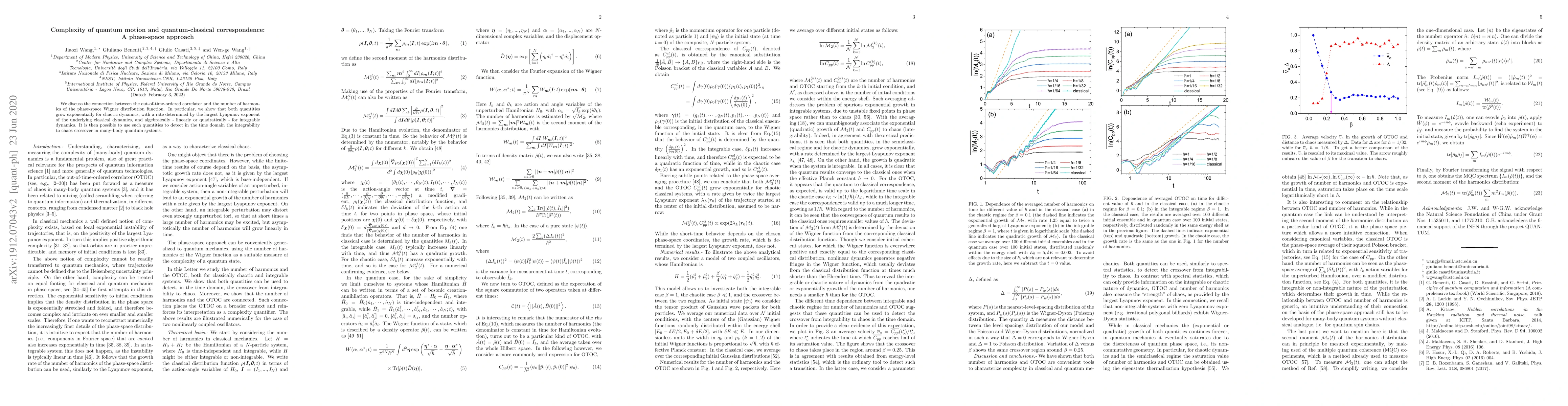 We discuss the connection between the out-of-time-ordered correlator and the number of harmonics of the phase-space Wigner distribution function. In particular, we show that both quantities grow exponentially for chaotic dynamics, with a rate determined by the largest Lyapunov exponent of the underlying classical dynamics, and algebraically -- linearly or quadratically -- for integrable dynamics. It is then possible to use such quantities to detect in the time domain the integrability to chaos crossover in many-body quantum systems.