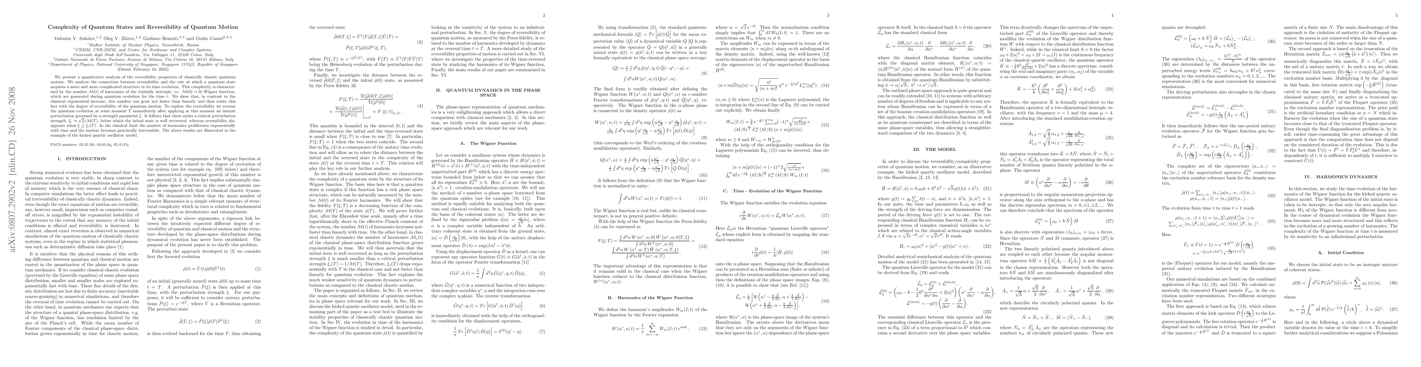 We present a quantitative analysis of the reversibility properties of classically chaotic quantum motion. We analyze the connection between reversibility and the rate at which a quantum state acquires a more and more complicated structure in its time evolution. This complexity is characterized by the number ${\cal M}(t)$ of harmonics of the (initially isotropic, i.e. ${\cal M}(0)=0$) Wigner function, which are generated during quantum evolution for the time $t$. We show that, in contrast to the classical exponential increase, this number can grow not faster than linearly and then relate this fact with the degree of reversibility of the quantum motion. To explore the reversibility we reverse the quantum evolution at some moment $T$ immediately after applying at this moment an instant perturbation governed by a strength parameter $\xi$. It follows that there exists a critical perturbation strength, $\xi_c\approx \sqrt{2}/{\cal M}(T)$, below which the initial state is well recovered, whereas reversibility disappears when $\xi\gtrsim \xi_c(T)$. In the classical limit the number of harmonics proliferates exponentially with time and the motion becomes practically irreversible. The above results are illustrated in the example of the kicked quartic oscillator model.