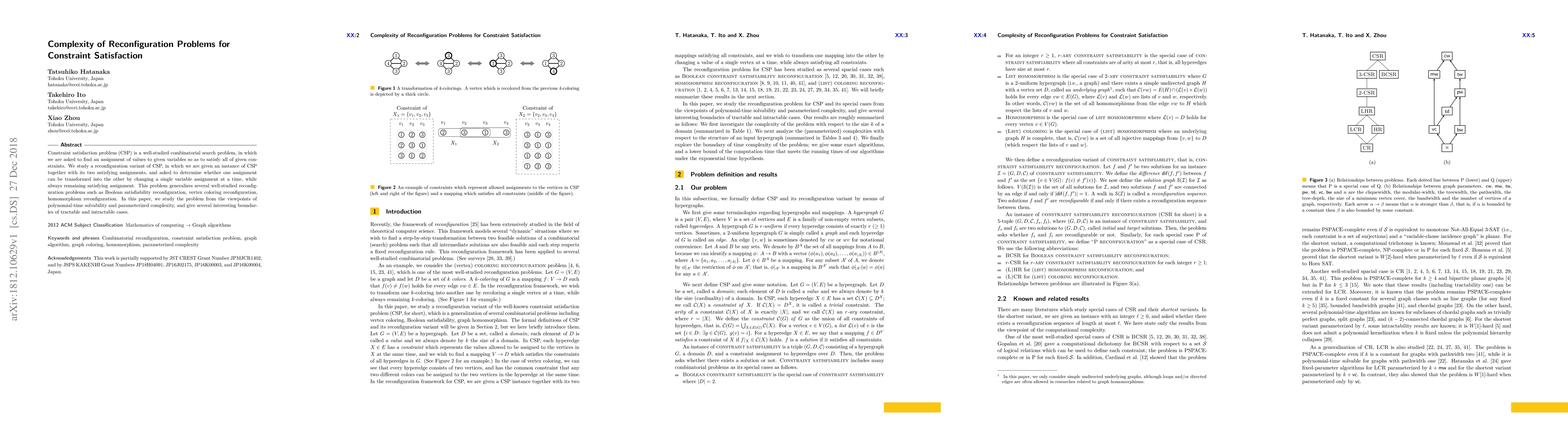 This paper investigates the reconfiguration variant of constraint satisfaction problems (CSP), focusing on transforming one satisfying assignment into another by iteratively changing single variable assignments. It explores the problem's complexity, identifying boundaries between tractable and intractable cases in terms of polynomial-time solvability and parameterized complexity.