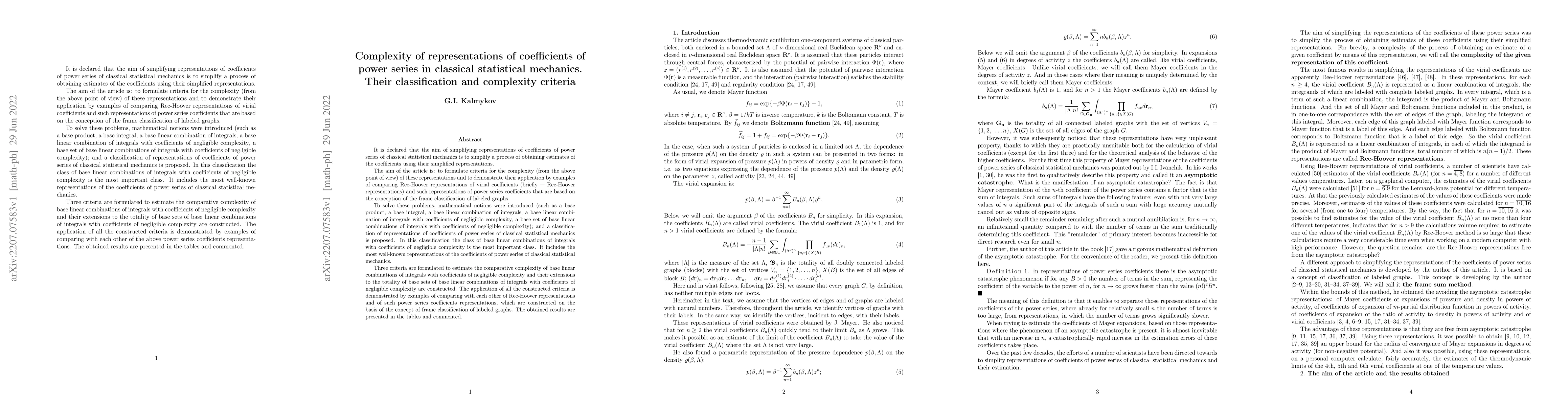 This paper aims to simplify the representations of coefficients in power series of classical statistical mechanics by introducing new mathematical notions and criteria for complexity. It proposes a classification of these representations, focusing on the most important class of base linear combinations of integrals with coefficients of negligible complexity, and demonstrates the application of formulated complexity criteria through comparative examples.