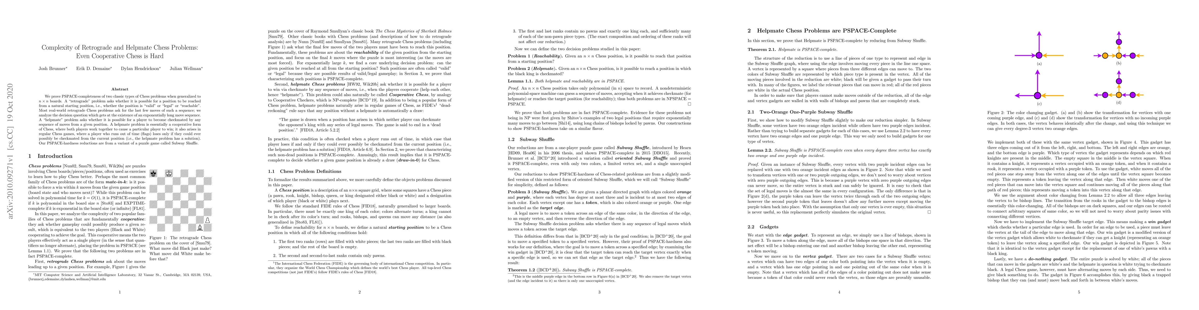 This paper proves the PSPACE-completeness of retrograde and helpmate chess problems on n-by-n boards, demonstrating that determining the validity of positions and the possibility of checkmate in cooperative chess scenarios is computationally challenging. The results are derived through reductions from the puzzle game Subway Shuffle.