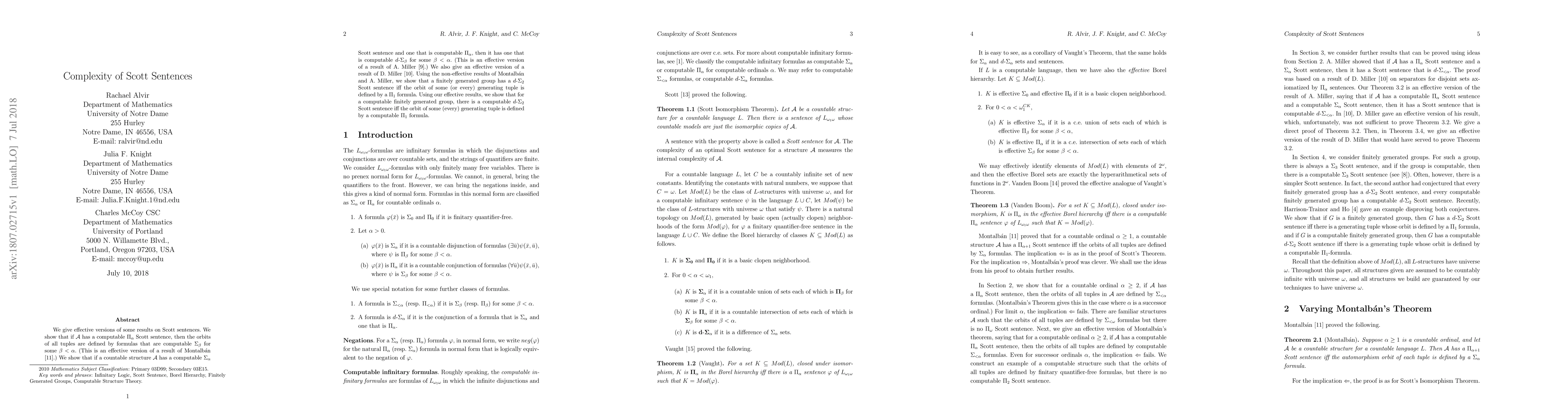 We give effective versions of some results on Scott sentences. We show that if $\mathcal{A}$ has a computable $\Pi_\alpha$ Scott sentence, then the orbits of all tuples are defined by formulas that are computable $\Sigma_\beta$ for some $\beta <\alpha$. (This is an effective version of a result of Montalb\'{a}n.) We show that if a countable structure $\mathcal{A}$ has a computable $\Sigma_\alpha$ Scott sentence and one that is computable $\Pi_\alpha$, then it has one that is computable $d$-$\Sigma_\beta$ for some $\beta < \alpha$. (This is an effective version of a result of A. Miller.) We also give an effective version of a result of D. Miller. Using the non-effective results of Montalb\'{a}n and A. Miller, we show that a finitely generated group has a $d$-$\Sigma_2$ Scott sentence iff the orbit of some (or every) generating tuple is defined by a $\Pi_1$ formula. Using our effective results, we show that for a computable finitely generated group, there is a computable $d$-$\Sigma_2$ Scott sentence iff the orbit of some (every) generating tuple is defined by a computable $\Pi_1$ formula.