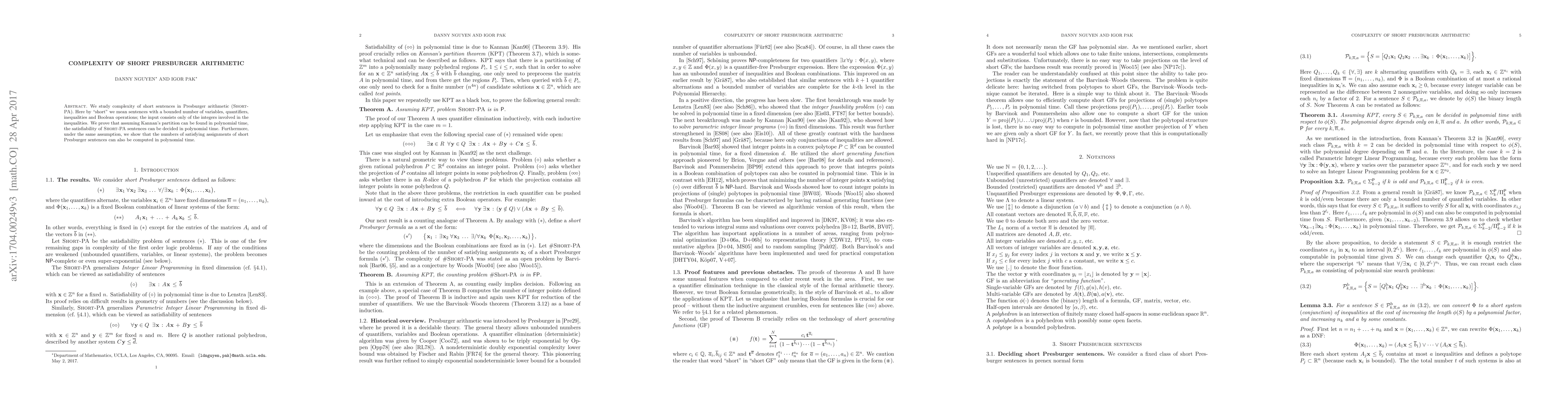 This paper investigates the complexity of short Presburger arithmetic (Short-PA) sentences, proving that under the assumption that Kannan's partition can be found in polynomial time, both the satisfiability and the count of satisfying assignments for these sentences can be determined in polynomial time.