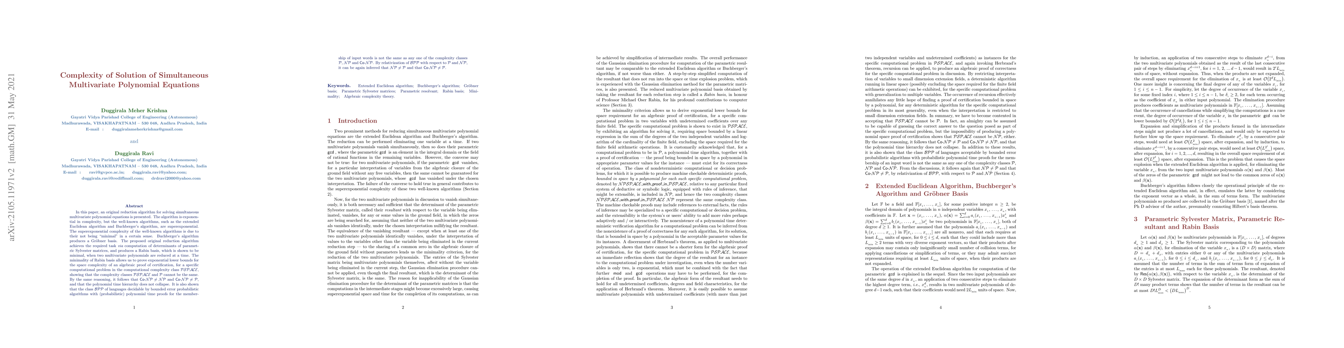 In this paper, an original reduction algorithm for solving simultaneous multivariate polynomial equations is presented. The algorithm is exponential in complexity, but the well-known algorithms, such as the extended Euclidean algorithm and Buchberger's algorithm, are superexponential. The superexponential complexity of the well-known algorithms is due to their not being "minimal" in a certain sense. Buchberger's algorithm produces a Groebner basis. The proposed original reduction algorithm achieves the required task, via computation of determinants of parametric Sylvester matrices, and produces a Rabin basis, which is shown to be minimal, when two multivariate polynomials are reduced at a time. The minimality of Rabin basis allows us to prove exponential lower bounds for the space complexity of an algebraic proof of certification, for a specific computational problem in the computational complexity class PSPACE, showing that the complexity classes PSPACE and P cannot be the same. By the same reasoning, it follows that Co-NP is not the same as either of the complexity classes NP and P, and that the polynomial time hierarchy does not collapse. It is also shown that the class BPP of languages decidable by bounded error probabilistic algorithms with (probabilistic) polynomial time proofs for the membership of input words is not the same as any one of the complexity classes P, NP and Co-NP. It follows again, from the discussions, that the complexity classes NP and P are not the same, by relativization of BPP, with respect to P and NP.