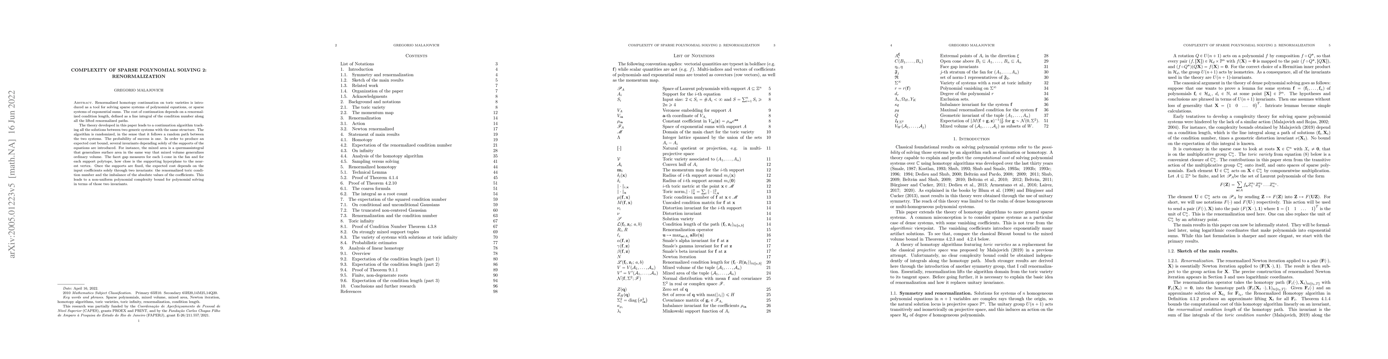 Researchers introduce a new method for solving sparse polynomial equations called renormalized homotopy continuation on toric varieties, which provides a non-uniform polynomial complexity bound based on input coefficients' invariants.