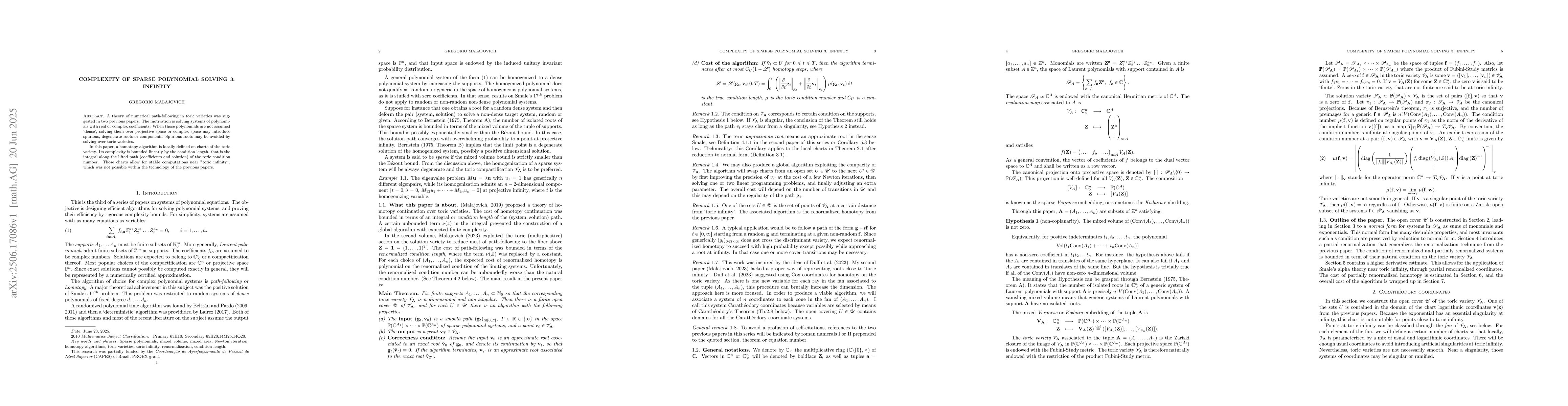 A theory of numerical path-following in toric varieties was suggested in two previous papers. The motivation is solving systems of polynomials with real or complex coefficients. When those polynomials are not assumed 'dense', solving them over projective space or complex space may introduce spurious, degenerate roots or components. Spurious roots may be avoided by solving over toric varieties. In this paper, a homotopy algorithm is locally defined on charts of the toric variety. Its complexity is bounded linearly by the condition length, that is the integral along the lifted path (coefficients and solution) of thetoric condition number. Those charts allow for stable computations near "toric infinity",which was not possible within the technology of the previous papers.