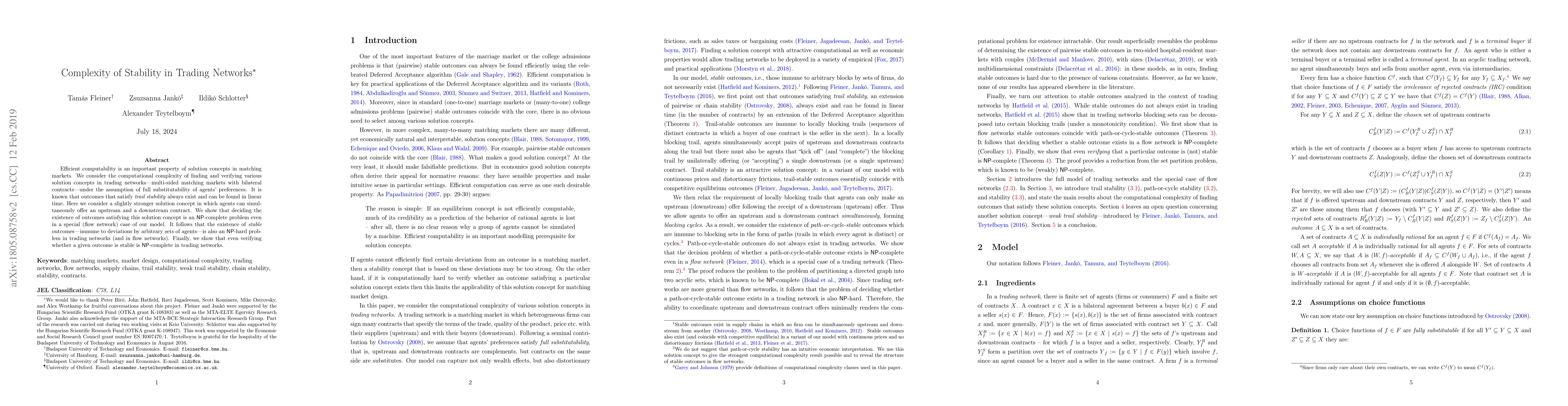 Efficient computability is an important property of solution concepts in matching markets. We consider the computational complexity of finding and verifying various solution concepts in trading networks-multi-sided matching markets with bilateral contracts-under the assumption of full substitutability of agents' preferences. It is known that outcomes that satisfy trail stability always exist and can be found in linear time. Here we consider a slightly stronger solution concept in which agents can simultaneously offer an upstream and a downstream contract. We show that deciding the existence of outcomes satisfying this solution concept is an NP-complete problem even in a special (flow network) case of our model. It follows that the existence of stable outcomes--immune to deviations by arbitrary sets of agents-is also an NP-hard problem in trading networks (and in flow networks). Finally, we show that even verifying whether a given outcome is stable is NP-complete in trading networks.