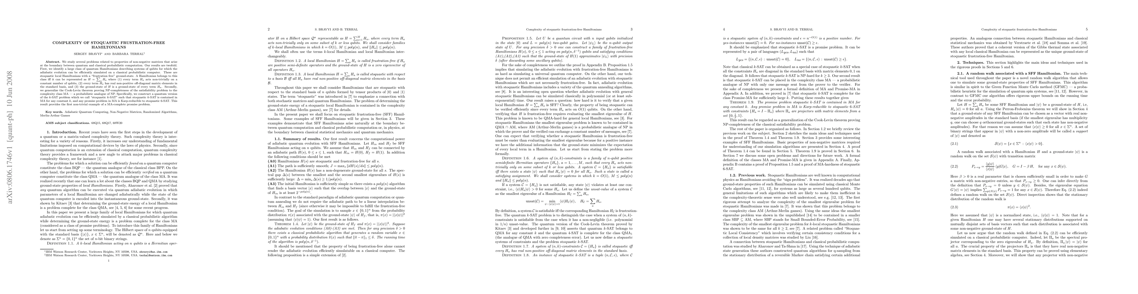 This paper explores the properties of stoquastic frustration-free Hamiltonians, identifying a class of quantum systems whose adiabatic evolution can be efficiently simulated on classical computers. It also generalizes the Cook-Levin theorem to prove the NP-completeness of a quantum version of the satisfiability problem within the complexity class MA.