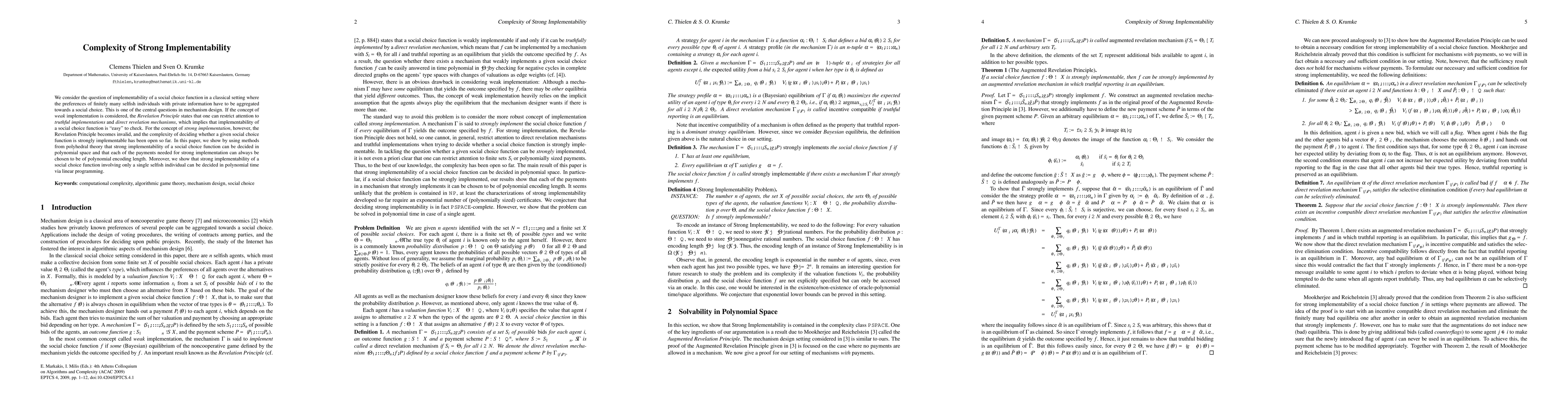 This paper investigates the complexity of strong implementability in social choice functions, demonstrating that it can be decided in polynomial space and that payments can be polynomially encoded. It also shows that strong implementability for a single selfish individual can be resolved in polynomial time using linear programming.