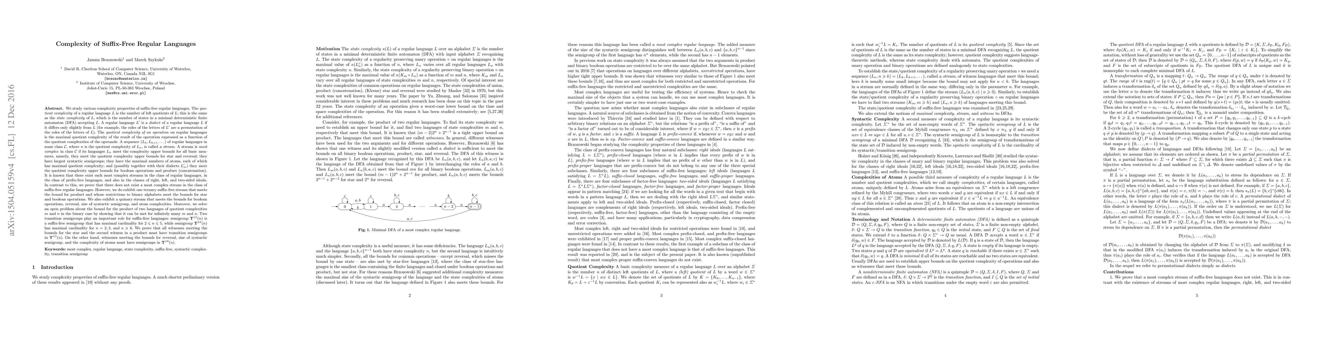 We study various complexity properties of suffix-free regular languages. The quotient complexity of a regular language $L$ is the number of left quotients of $L$; this is the same as the state complexity of $L$. A regular language $L'$ is a dialect of a regular language $L$ if it differs only slightly from $L$. The quotient complexity of an operation on regular languages is the maximal quotient complexity of the result of the operation expressed as a function of the quotient complexities of the operands. A sequence $(L_k,L_{k+1},\dots)$ of regular languages in some class ${\mathcal C}$, where $n$ is the quotient complexity of $L_n$, is called a stream. A stream is most complex in class ${\mathcal C}$ if its languages $L_n$ meet the complexity upper bounds for all basic measures. It is known that there exist such most complex streams in the class of regular languages, in the class of prefix-free languages, and also in the classes of right, left, and two-sided ideals. In contrast to this, we prove that there does not exist a most complex stream in the class of suffix-free regular languages. However, we do exhibit one ternary suffix-free stream that meets the bound for product and whose restrictions to binary alphabets meet the bounds for star and boolean operations. We also exhibit a quinary stream that meets the bounds for boolean operations, reversal, size of syntactic semigroup, and atom complexities. Moreover, we solve an open problem about the bound for the product of two languages of quotient complexities $m$ and $n$ in the binary case by showing that it can be met for infinitely many $m$ and $n$.