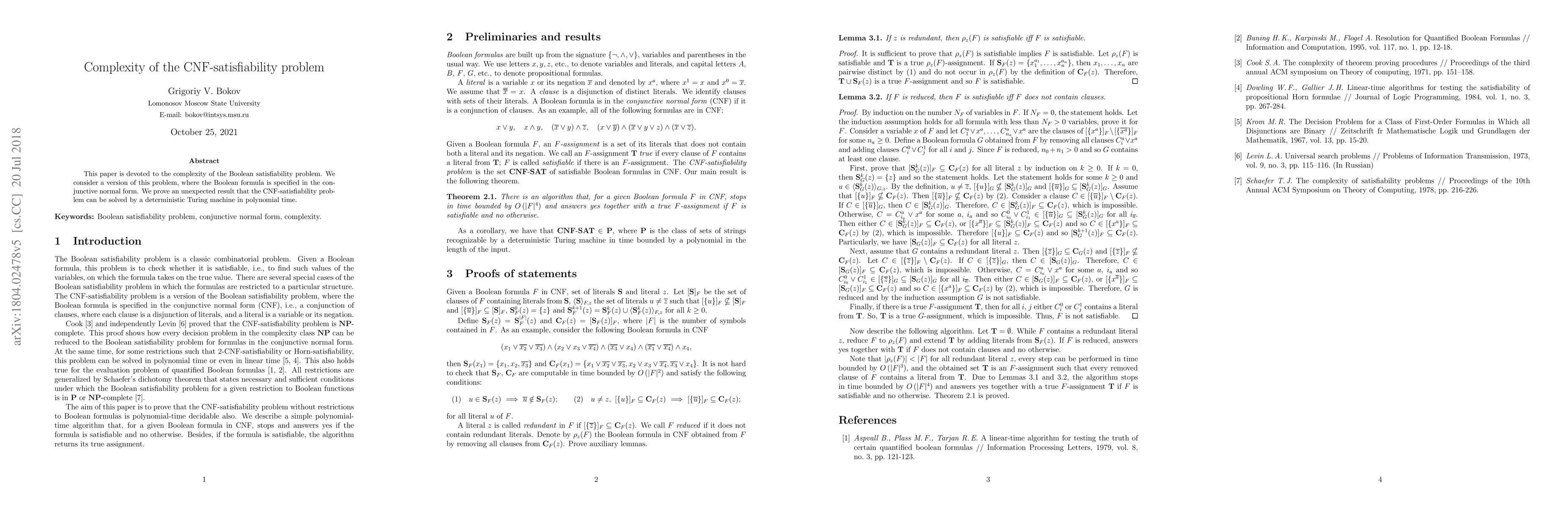 This paper is devoted to the complexity of the Boolean satisfiability problem. We consider a version of this problem, where the Boolean formula is specified in the conjunctive normal form. We prove an unexpected result that the CNF-satisfiability problem can be solved by a deterministic Turing machine in polynomial time.
