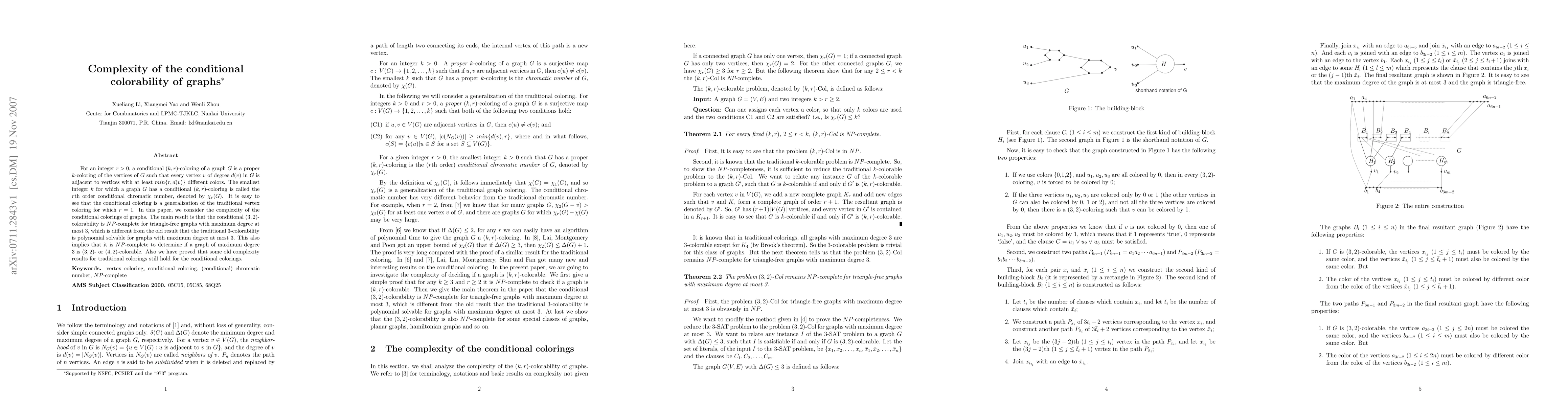For an integer $r>0$, a conditional $(k,r)$-coloring of a graph $G$ is a proper $k$-coloring of the vertices of $G$ such that every vertex $v$ of degree $d(v)$ in $G$ is adjacent to vertices with at least $min\{r, d(v)\}$ different colors. The smallest integer $k$ for which a graph $G$ has a conditional $(k,r)$-coloring is called the $r$th order conditional chromatic number, denoted by $\chi_r(G)$. It is easy to see that the conditional coloring is a generalization of the traditional vertex coloring for which $r=1$. In this paper, we consider the complexity of the conditional colorings of graphs. The main result is that the conditional $(3,2)$-colorability is $NP$-complete for triangle-free graphs with maximum degree at most 3, which is different from the old result that the traditional 3-colorability is polynomial solvable for graphs with maximum degree at most 3. This also implies that it is $NP$-complete to determine if a graph of maximum degree 3 is $(3,2)$- or $(4,2)$-colorable. Also we have proved that some old complexity results for traditional colorings still hold for the conditional colorings.