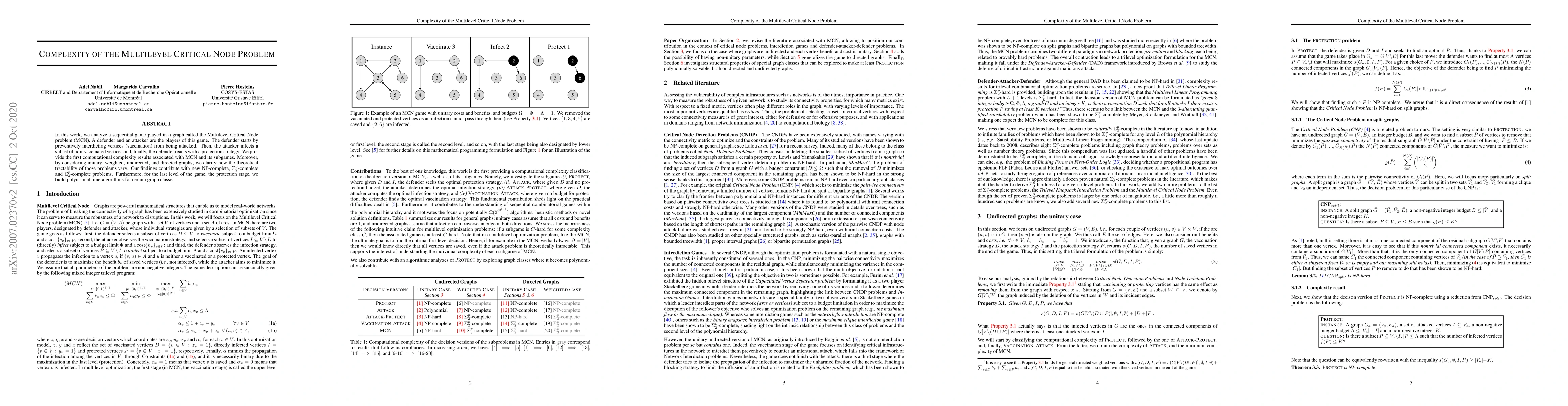 Researchers analyzed the Multilevel Critical Node problem, a game where a defender prevents an attacker from infecting vertices, finding new NP-complete problems with varying computational complexities depending on graph type.