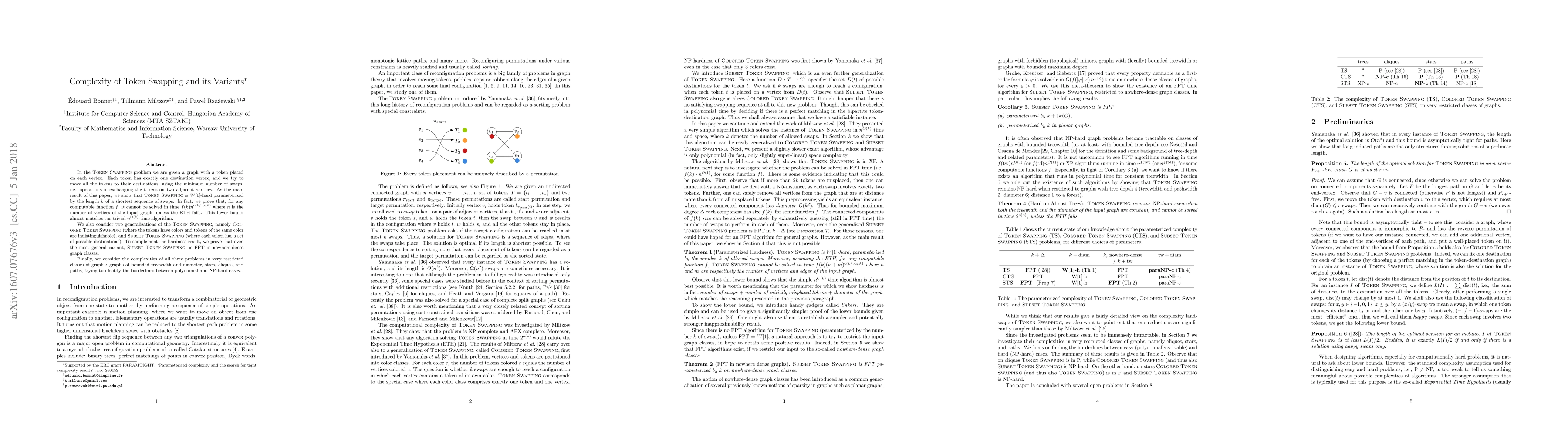 This paper demonstrates that the Token Swapping problem is $W[1]$-hard when parameterized by the length of a shortest sequence of swaps, establishing a lower bound that nearly matches existing algorithms. It also explores variants like Colored and Subset Token Swapping, proving that Subset Token Swapping remains fixed-parameter tractable in nowhere-dense graph classes. Additionally, the paper examines complexities within restricted graph classes to delineate polynomial vs. NP-hard cases.