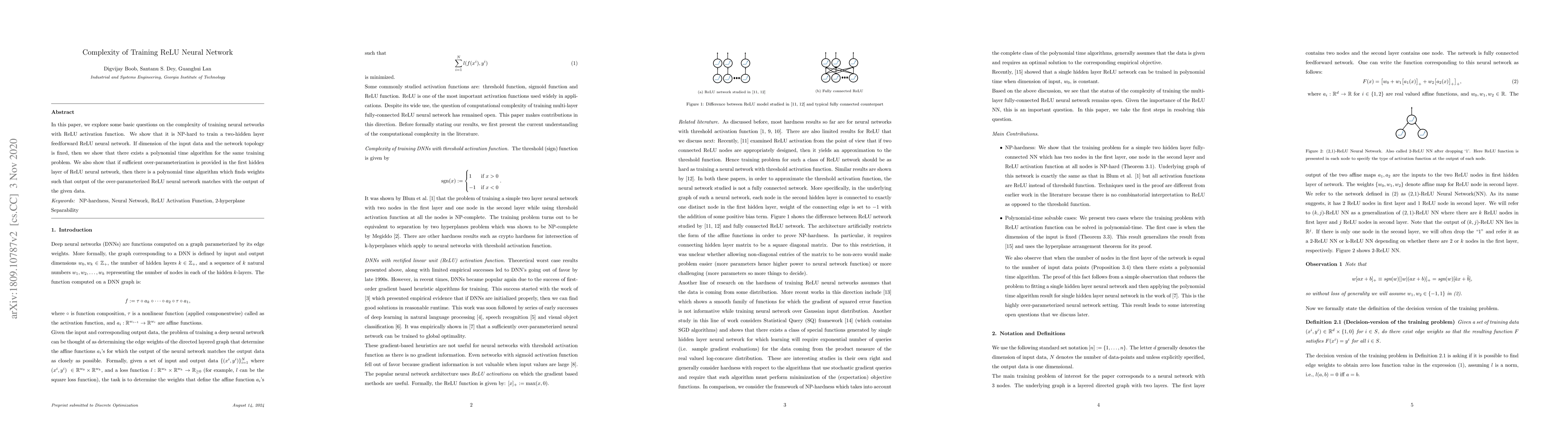 This paper investigates the complexity of training ReLU neural networks, demonstrating that training a two-hidden layer ReLU network is NP-hard. However, with a fixed input dimension and network topology, a polynomial time algorithm exists for training. Additionally, sufficient over-parameterization in the first hidden layer allows for a polynomial time algorithm to achieve desired output.