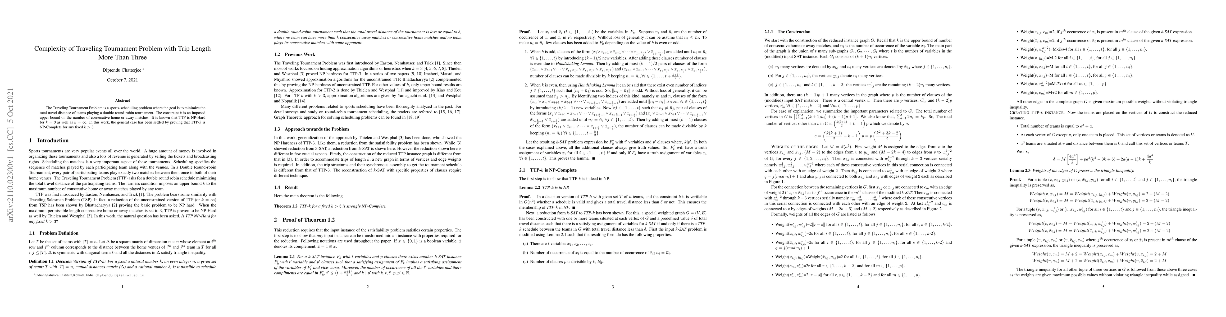 The Traveling Tournament Problem is a sports-scheduling problem where the goal is to minimize the total travel distance of teams playing a double round-robin tournament. The constraint 'k' is an imposed upper bound on the number of consecutive home or away matches. It is known that TTP is NP-Hard for k=3 as well as k=infinity. In this work, the general case has been settled by proving that TTP-k is NP-Complete for any fixed k>3.