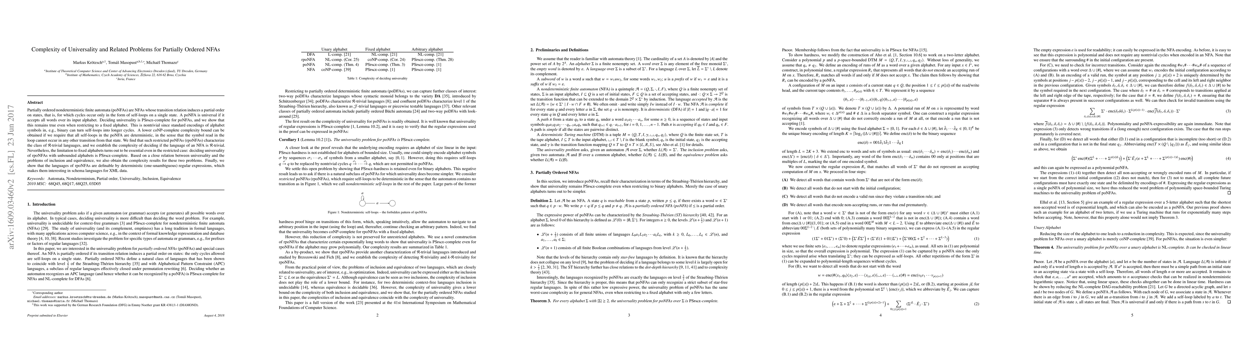 Partially ordered nondeterminsitic finite automata (poNFAs) are NFAs whose transition relation induces a partial order on states, that is, for which cycles occur only in the form of self-loops on a single state. A poNFA is universal if it accepts all words over its input alphabet. Deciding universality is PSPACE-complete for poNFAs, and we show that this remains true even when restricting to a fixed alphabet. This is nontrivial since standard encodings of alphabet symbols in, e.g., binary can turn self-loops into longer cycles. A lower coNP-complete complexity bound can be obtained if we require that all self-loops in the poNFA are deterministic, in the sense that the symbol read in the loop cannot occur in any other transition from that state. We find that such restricted poNFAs (rpoNFAs) characterise the class of $\mathcal{R}$-trivial languages, and we establish the complexity of deciding if the language of an NFA is $\mathcal{R}$-trivial. Nevertheless, the limitation to fixed alphabets turns out to be essential even in the restricted case: deciding universality of rpoNFAs with unbounded alphabets is PSPACE-complete. Based on a close relation between universality and the problems of inclusion and equivalence, we also obtain the complexity results for these two problems. Finaly, we show that the languages of rpoNFAs are definable by deterministic (one-unambiguous) regular expressions, which makes them interesting in schema languages for XML data.
