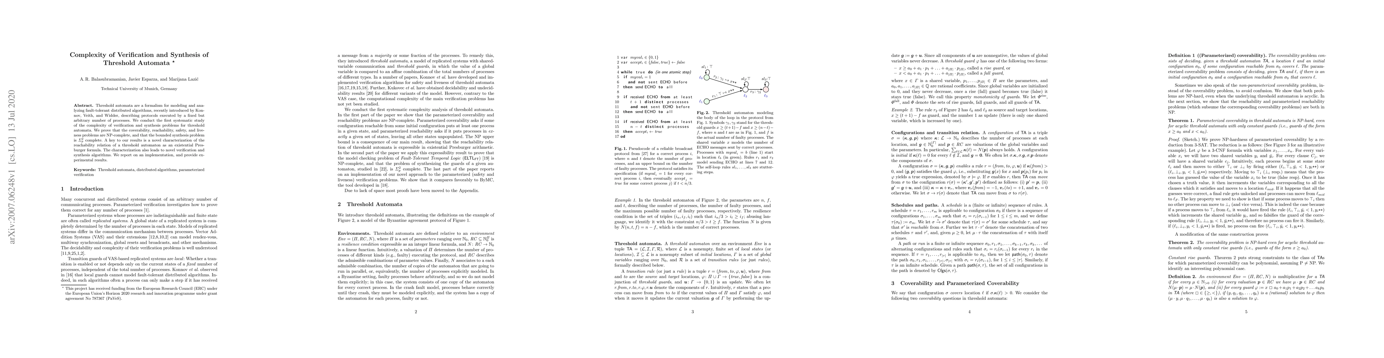Threshold automata are a formalism for modeling and analyzing fault-tolerant distributed algorithms, recently introduced by Konnov, Veith, and Widder, describing protocols executed by a fixed but arbitrary number of processes. We conduct the first systematic study of the complexity of verification and synthesis problems for threshold automata. We prove that the coverability, reachability, safety, and liveness problems are NP-complete, and that the bounded synthesis problem is $\Sigma_p^2$ complete. A key to our results is a novel characterization of the reachability relation of a threshold automaton as an existential Presburger formula. The characterization also leads to novel verification and synthesis algorithms. We report on an implementation, and provide experimental results.