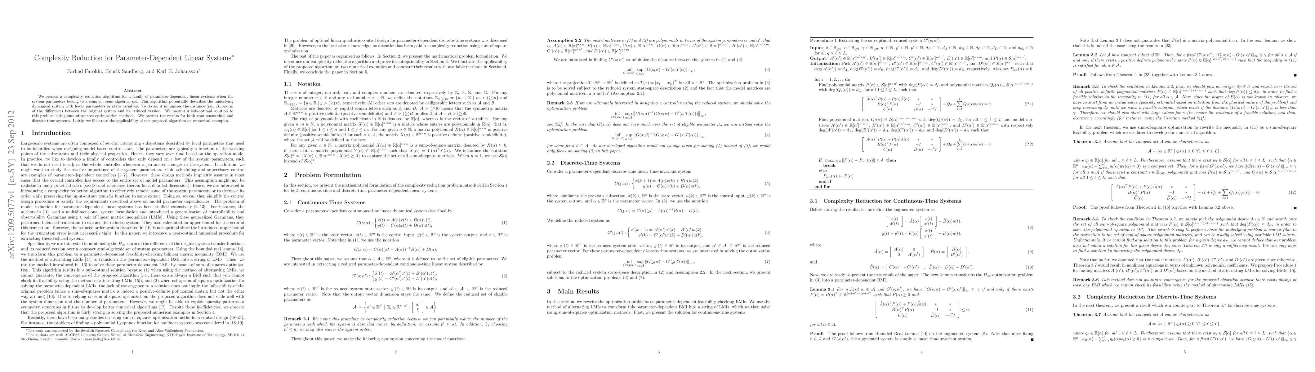 We present a complexity reduction algorithm for a family of parameter-dependent linear systems when the system parameters belong to a compact semi-algebraic set. This algorithm potentially describes the underlying dynamical system with fewer parameters or state variables. To do so, it minimizes the distance (i.e., H-infinity-norm of the difference) between the original system and its reduced version. We present a sub-optimal solution to this problem using sum-of-squares optimization methods. We present the results for both continuous-time and discrete-time systems. Lastly, we illustrate the applicability of our proposed algorithm on numerical examples.